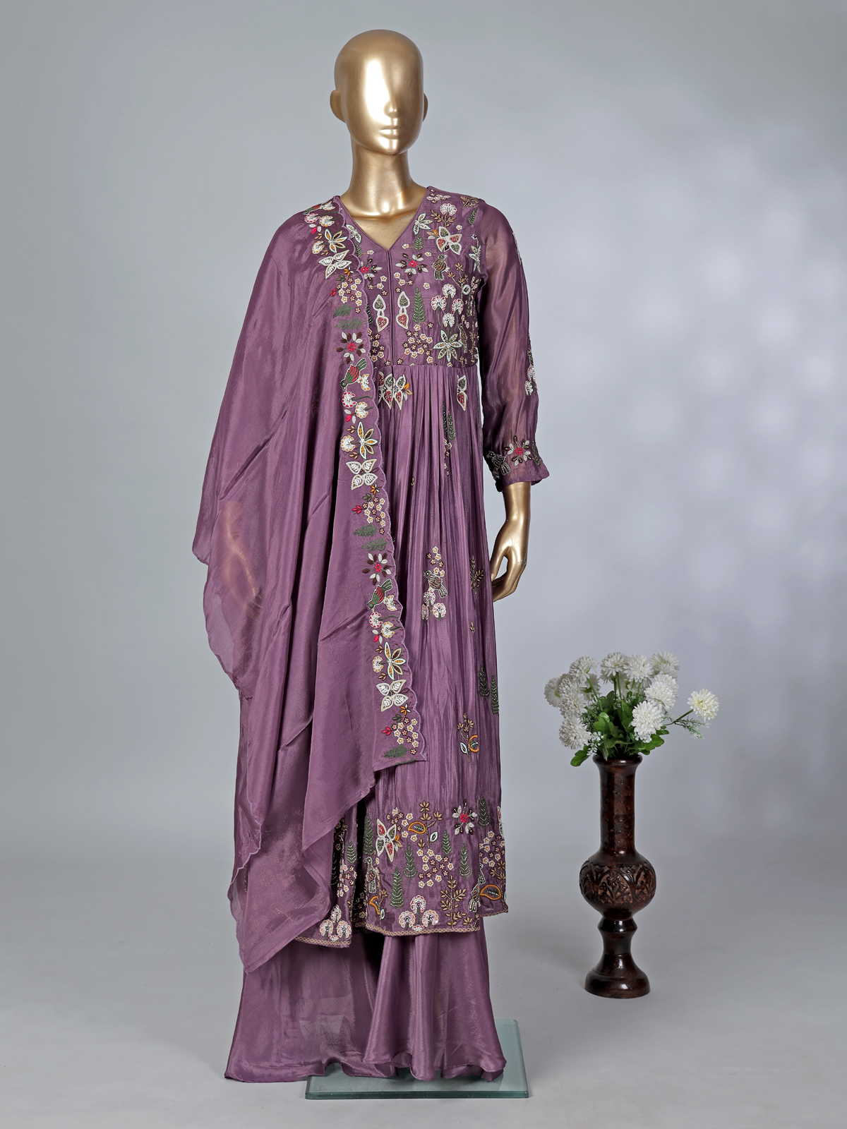 Purple Silk Pakistani Style Suit With Embroidered Palazzo And Dupatta