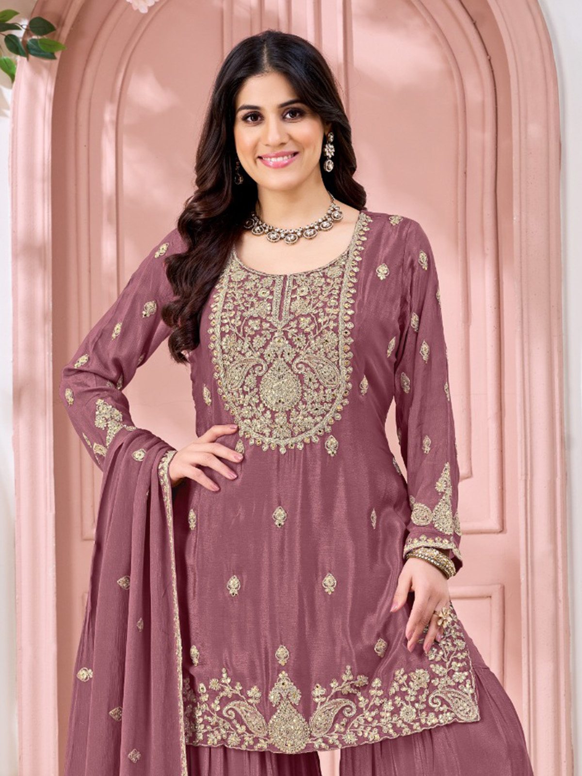 Royal purple hues highlight the charm of this silk pakistani style sharara suit. The kurti features a graceful round neckline with full sleeves and an elegant yoke design. Adorned with cutdana, sequins, beads and thread embellishments. Styled with a flowing sharara bottom and a dupatta. The ensemble creates a regal festive silhouette perfect for weddings and celebratory occasions.