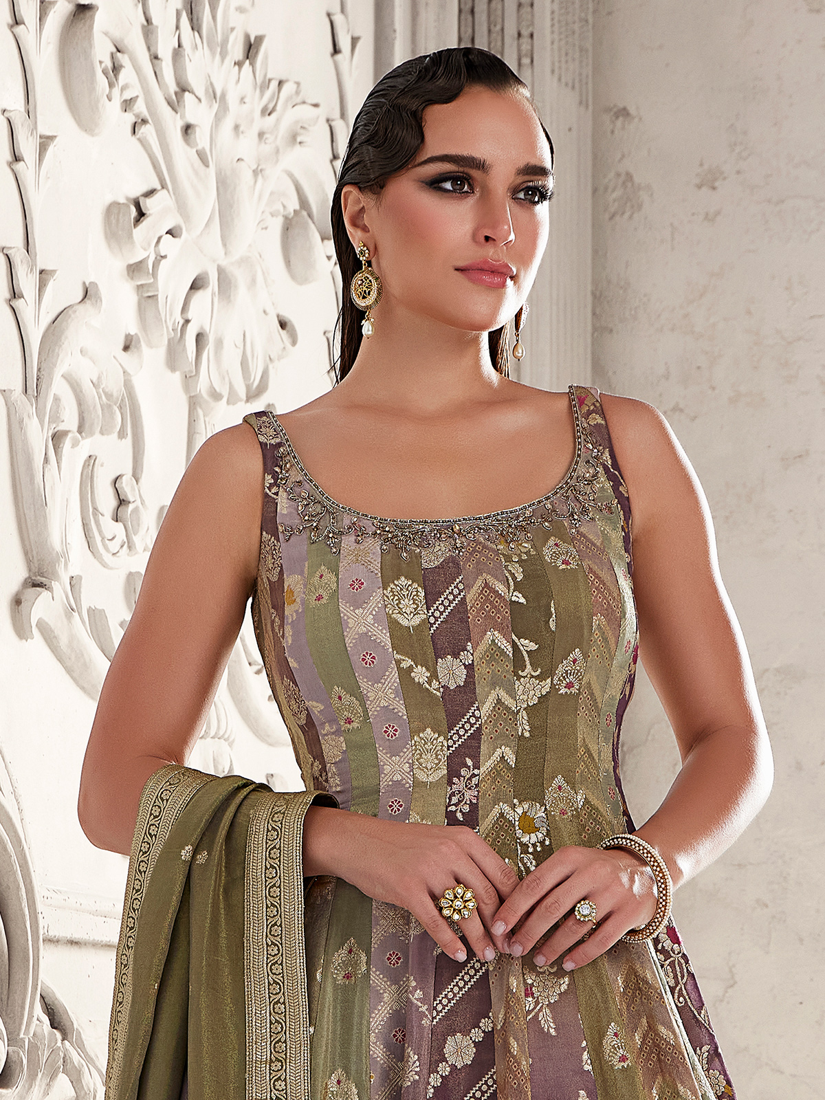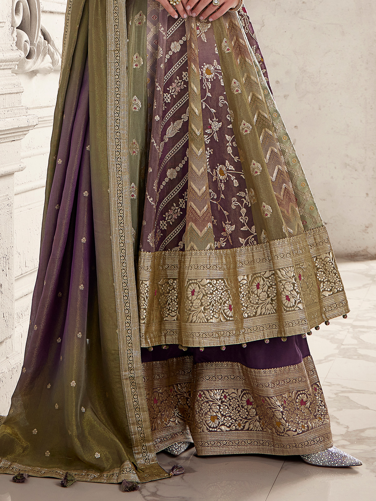 A refined purple silk palazzo suit featuring cutdana, beads, stone, zari and zardosi accents. Its round neckline and sleeveless design pair beautifully with the dupatta and palazzo, making it perfect for weddings, receptions and festive evenings.