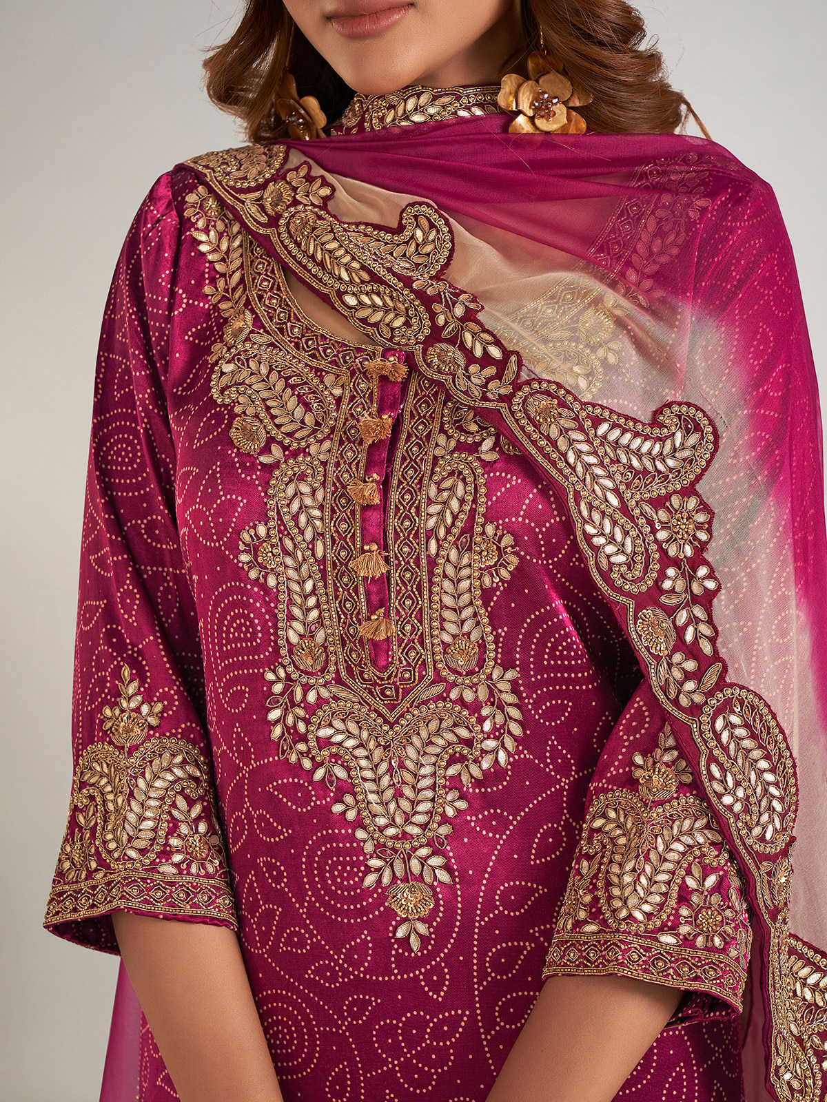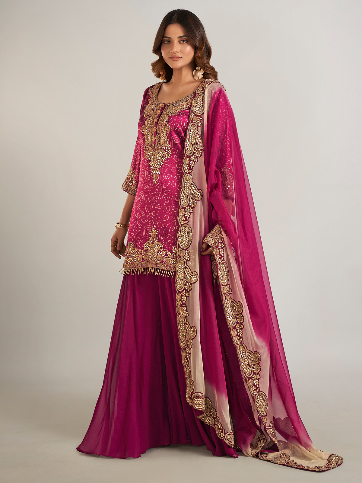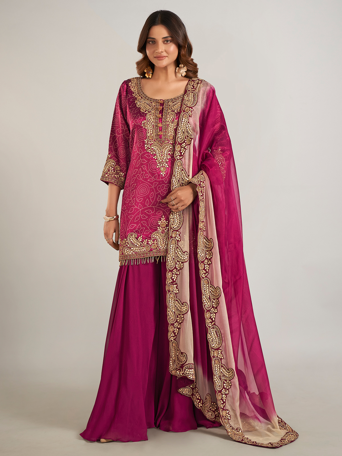Radiating timeless elegance, this purple printed silk palazzo suit is beautifully adorned with intricate detailing in cutdana, beads, pearls, sequins, zardosi, and gota work. Designed with a classic round neckline and graceful three-quarter sleeves, it is perfectly complemented by a dupatta, adding a refined touch to the ensemble.