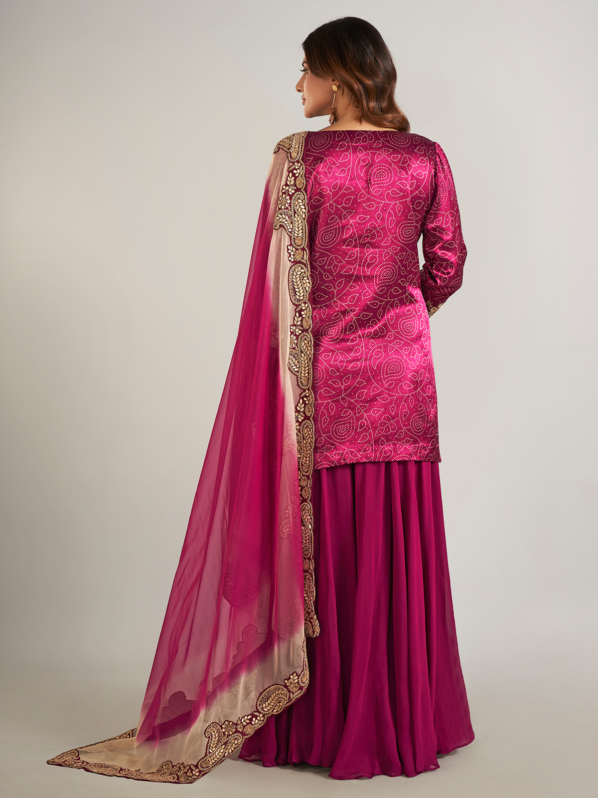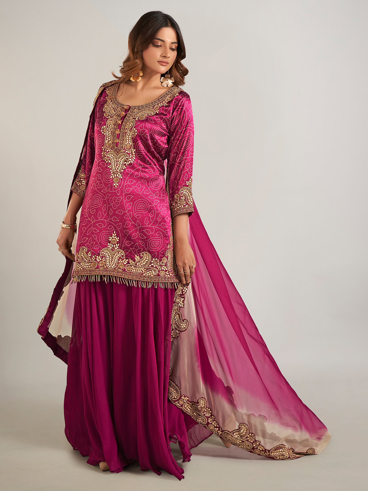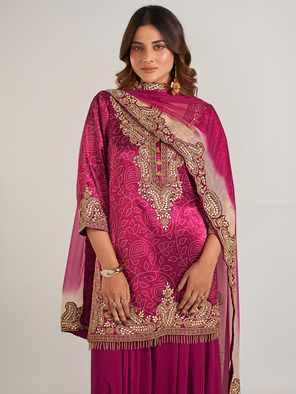 Radiating timeless elegance, this purple printed silk palazzo suit is beautifully adorned with intricate detailing in cutdana, beads, pearls, sequins, zardosi, and gota work. Designed with a classic round neckline and graceful three-quarter sleeves, it is perfectly complemented by a dupatta, adding a refined touch to the ensemble.