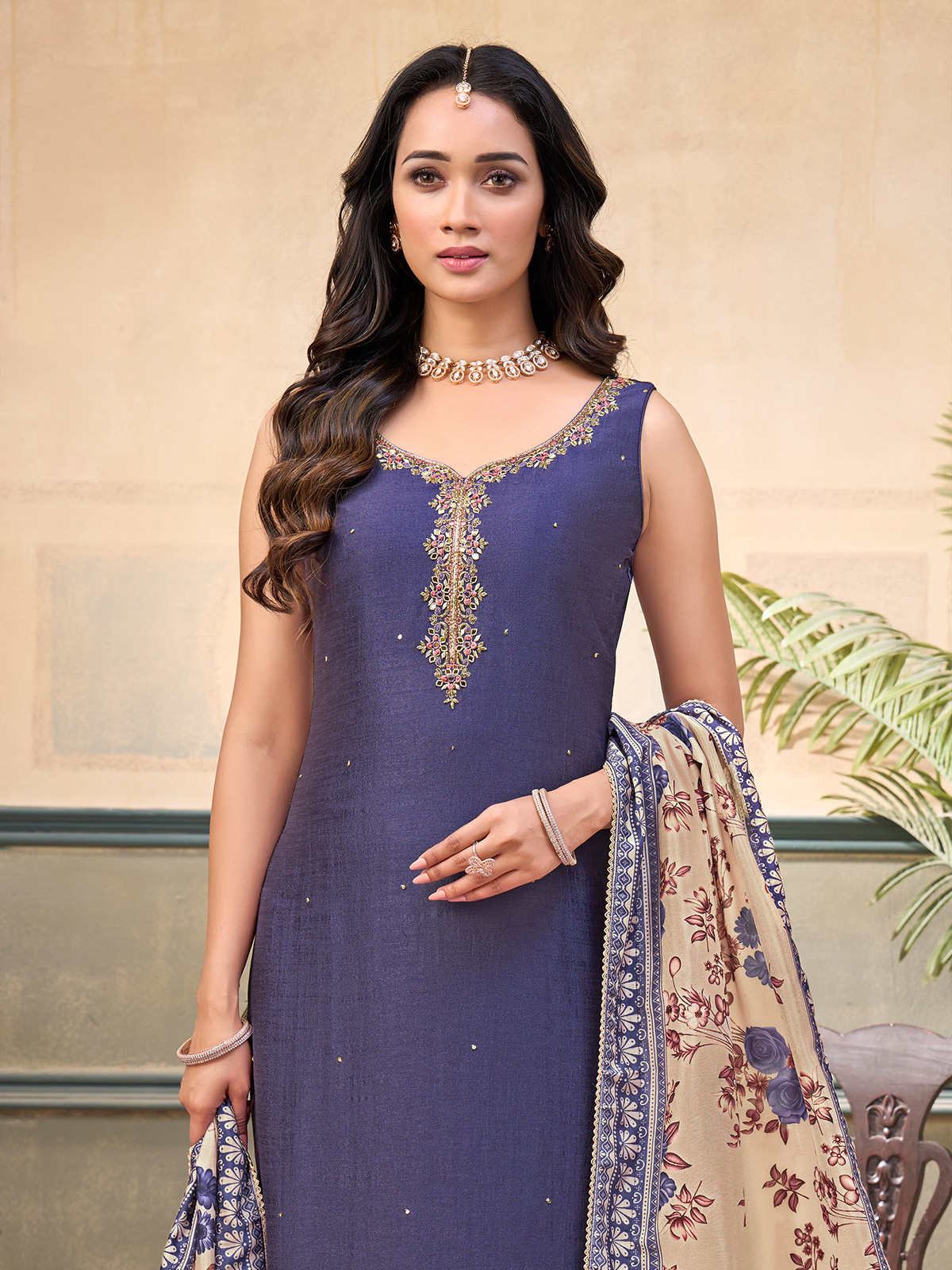 Royal purple highlight the richness of this silk straight cut salwar suit crafted for festive elegance. The kurti features a flattering sweetheart neckline with a sleeveless design, adorned with thread, bead, sequin and zardosi embellishments that add luxurious shimmer. Styled with comfortable pants and a printed dupatta. The ensemble forms a striking festive silhouette.