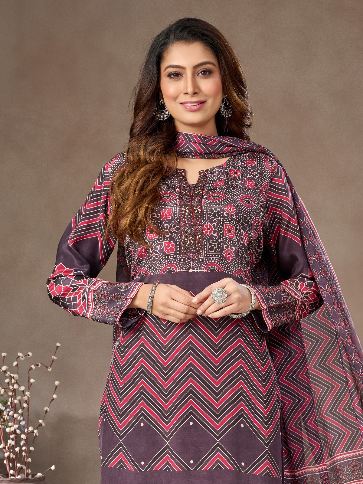 Rich purple silk forms the base of this pant suit, detailed with aabla, sequins, and thread work. A sweetheart neckline and full sleeves create a timeless silhouette, ideal for celebrations.