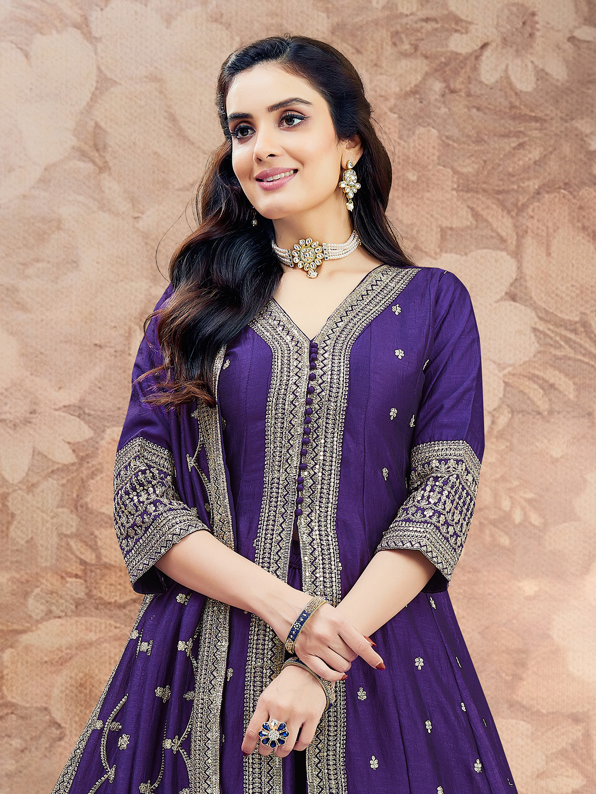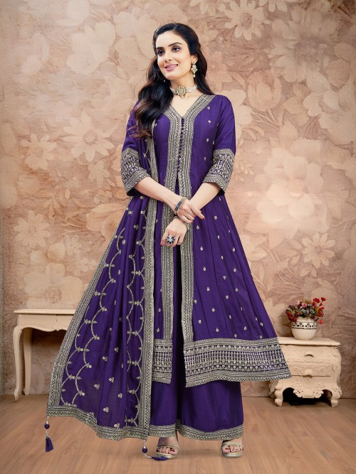 This royal purple silk suit is styled with tasteful resham and sequin highlights. A flattering V-neck and quarter sleeves give it a mature yet modern appeal. Paired with a Pakistani-style dupatta and palazzo pants, it’s a balanced blend of classic tradition and contemporary design for festive wear.