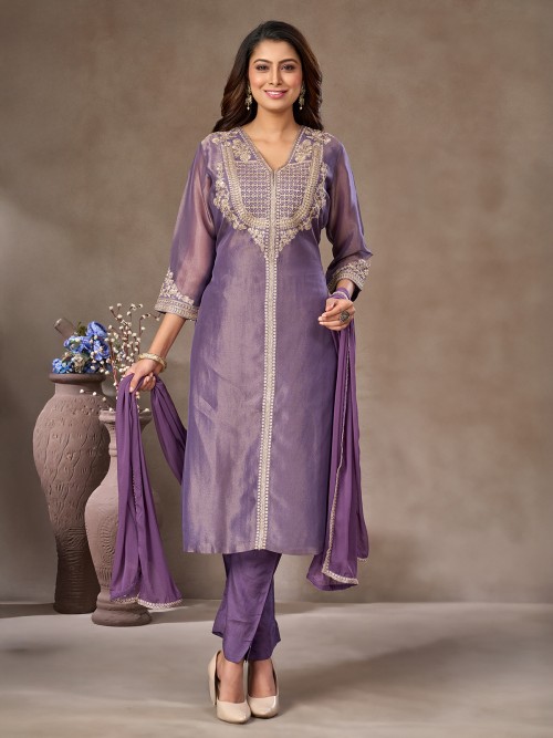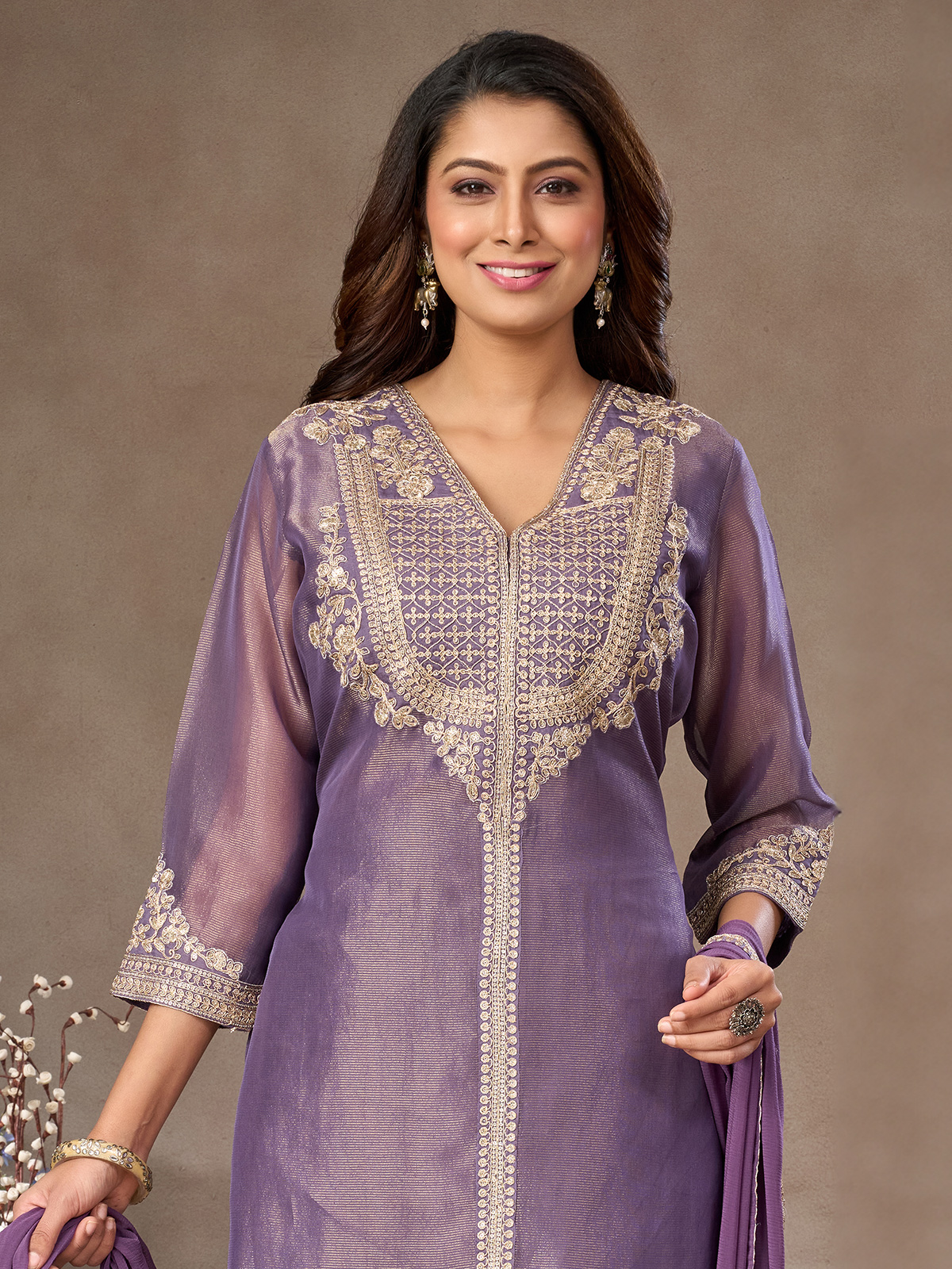 A royal purple tissue silk suit beautifully adorned with resham, sequins, and zari. Featuring a V neckline and quarter sleeves, paired with a dupatta, this pant set exudes regal charm—perfect for weddings, sangeet, or Diwali evenings.