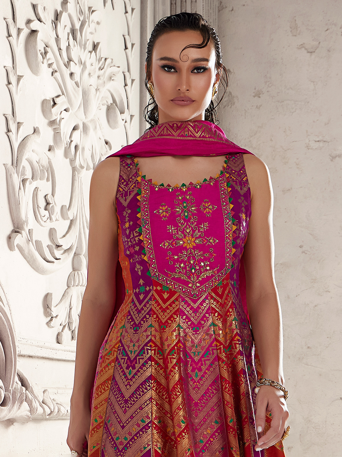This rani-pink silk palazzo suit sparkles with cutdana, sequins, beads, mirror, zardosi and zari work. The round neckline and sleeveless design bring graceful balance, paired with palazzo and dupatta for festive, reception and wedding elegance.