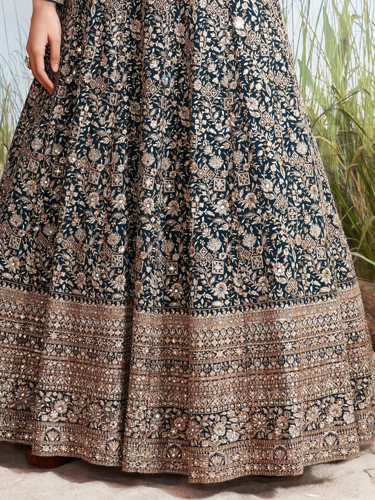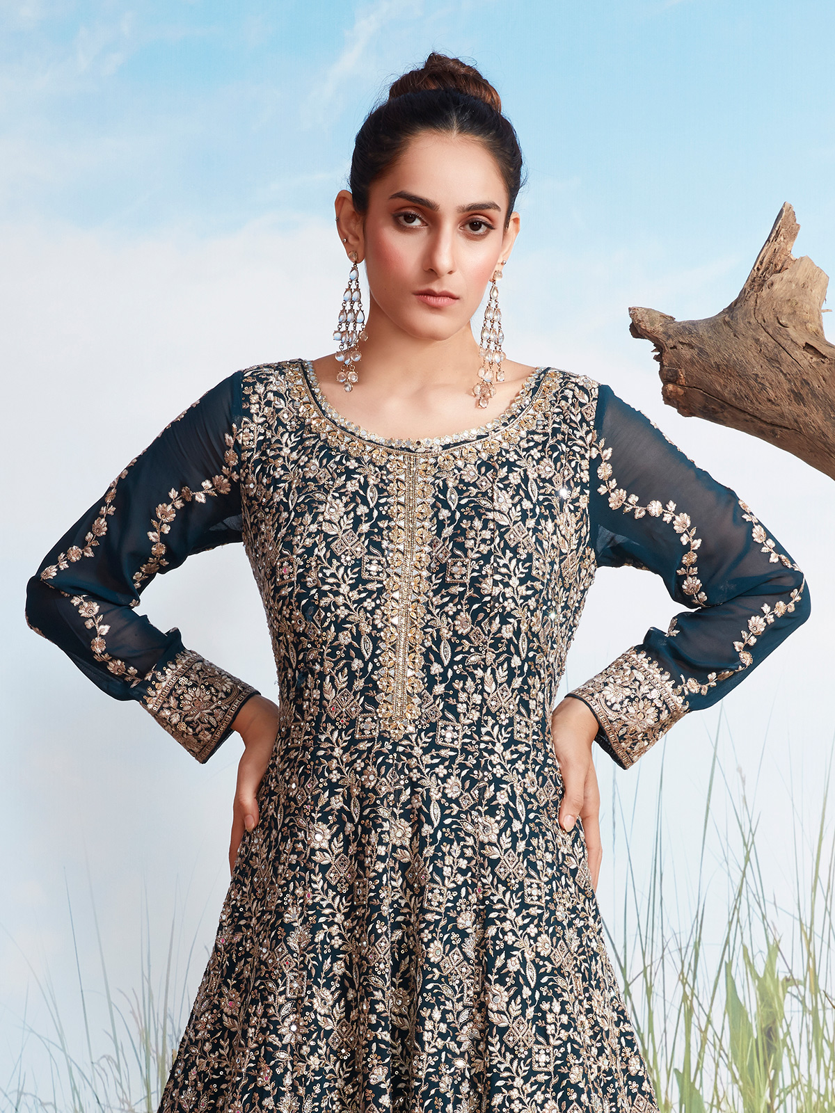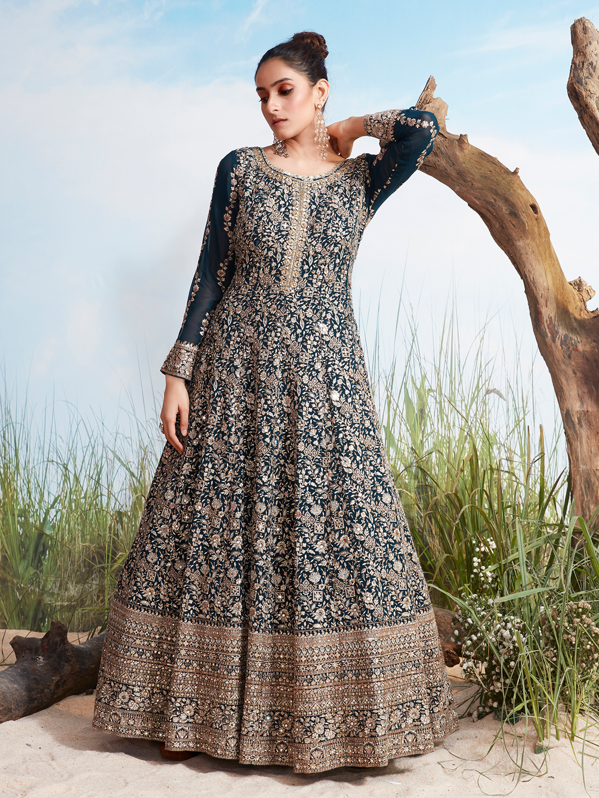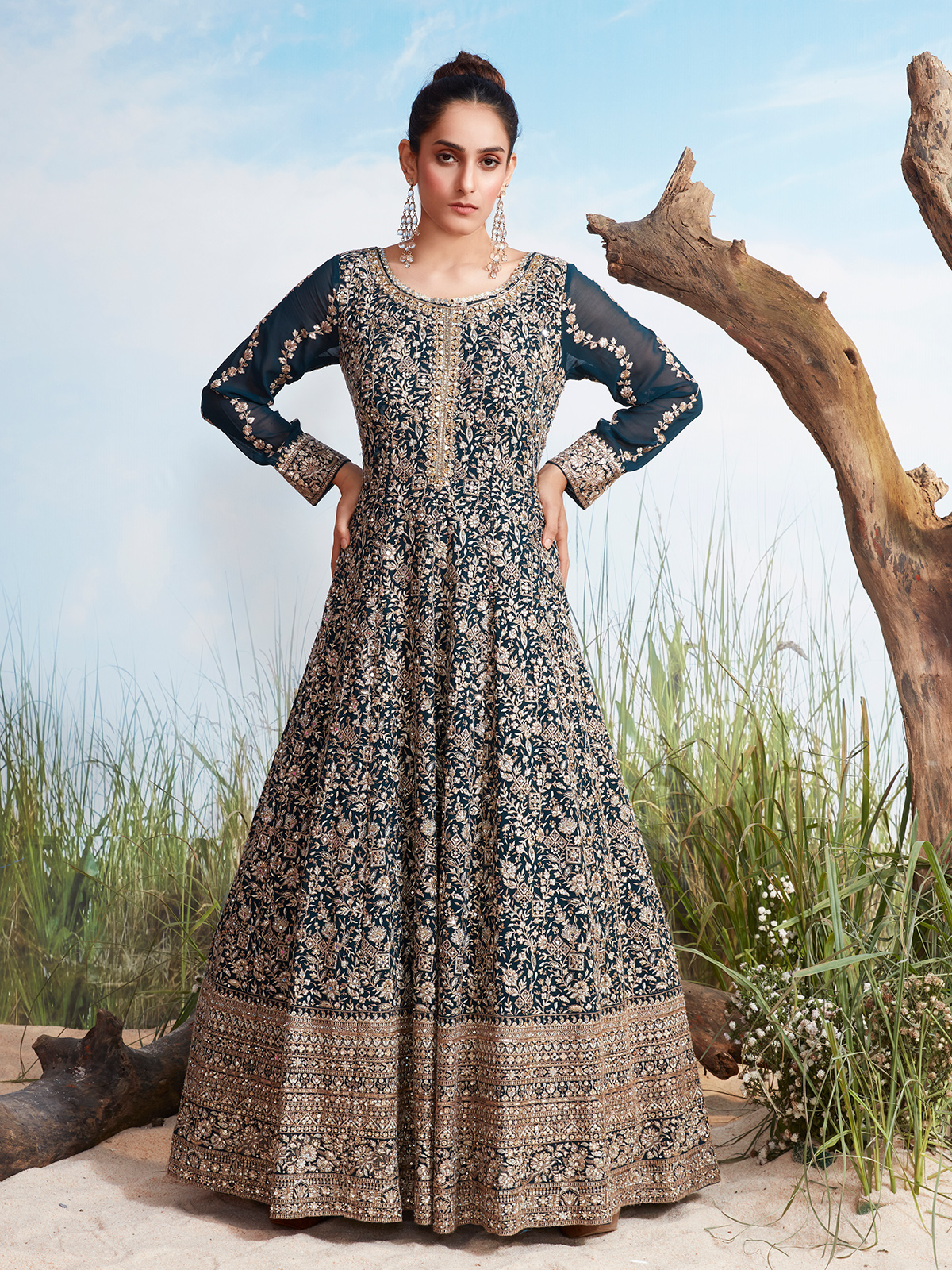 This rama blue georgette creation is adorned with delicate resham embroidery, sparkling sequins, and mirror embellishments. Featuring a round neckline and full sleeves, the floor-length silhouette drapes beautifully for an elegant finish. Ideal for wedding functions and receptions, it delivers graceful charm with contemporary appeal.