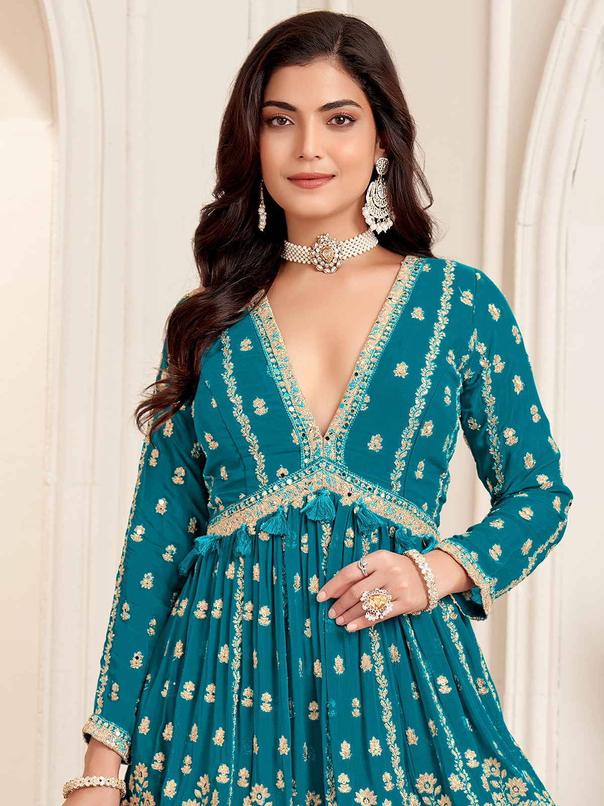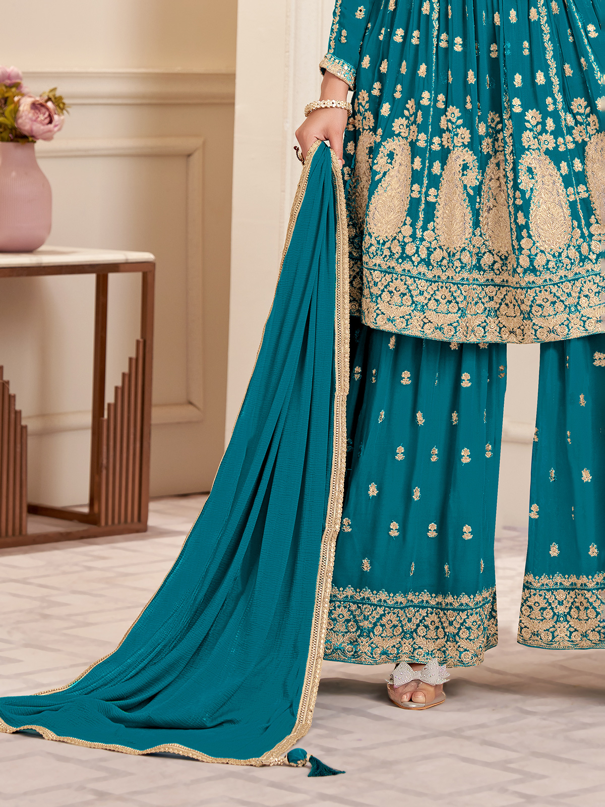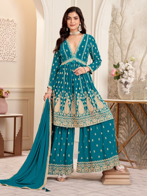This rama blue Pakistani palazzo suit in georgette is decorated with embroidery, sequins, and mirror work. Styled with a dupatta, V neckline, and quarter sleeves, it is an ideal choice for wedding occasions, blending elegance with festive charm.