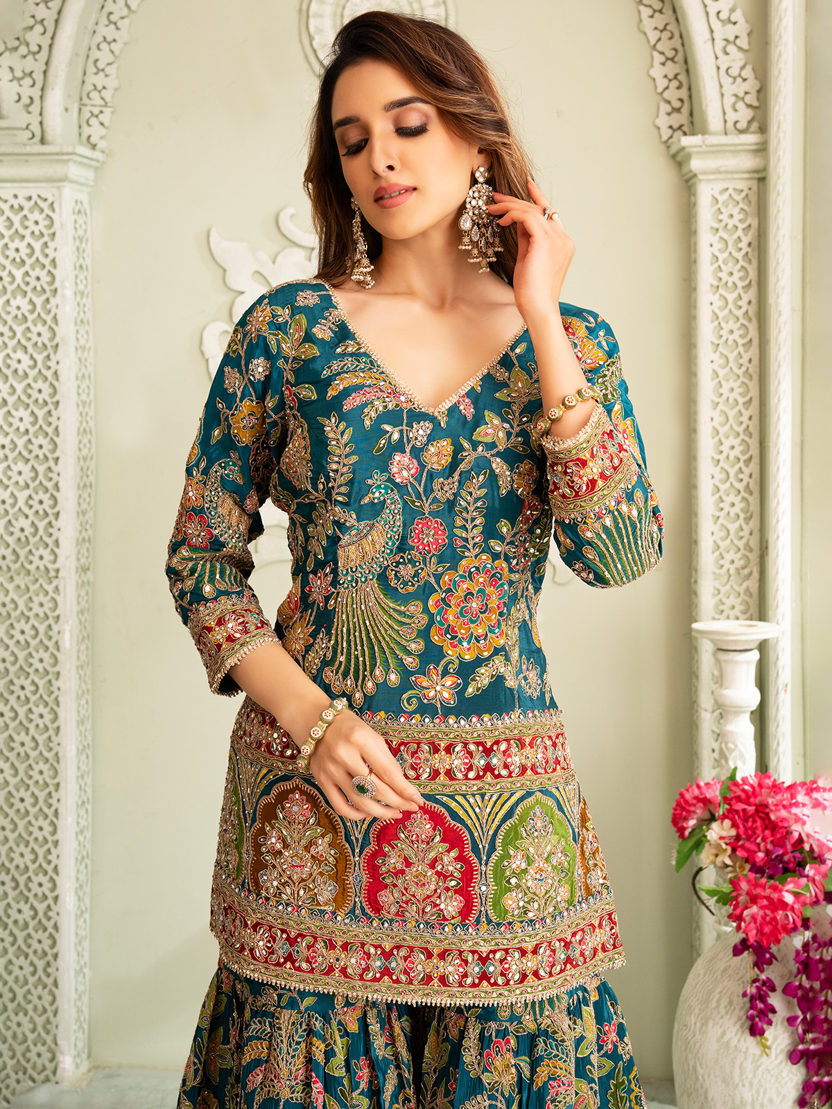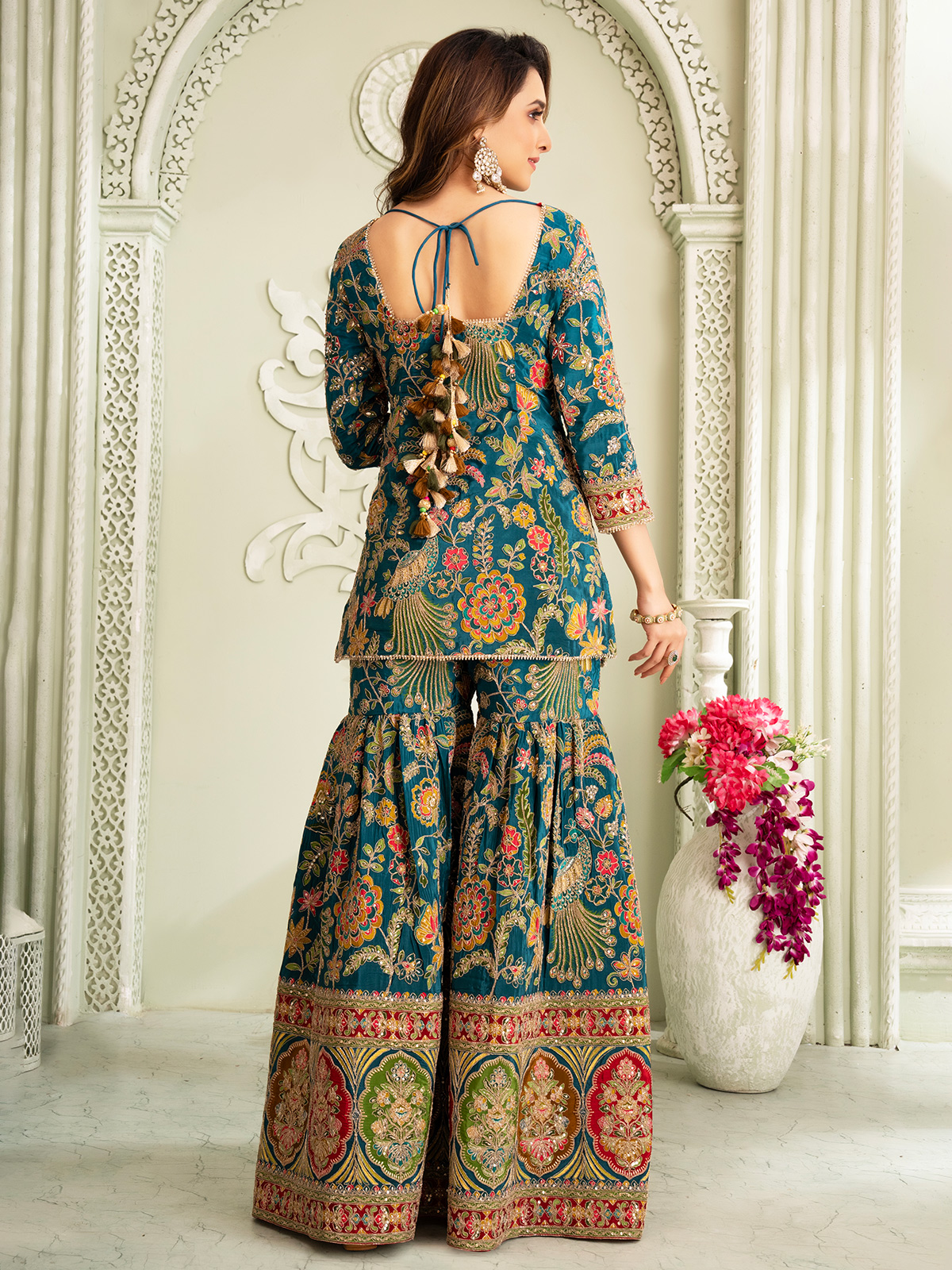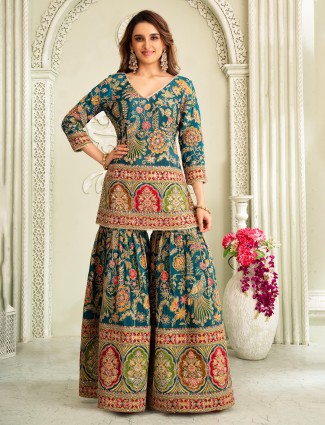 This rama blue Pakistani-style silk sharara suit dazzles with zardosi, resham, sequins, stone and mirror work. V-neck and quarter sleeves enhance its wedding appeal.