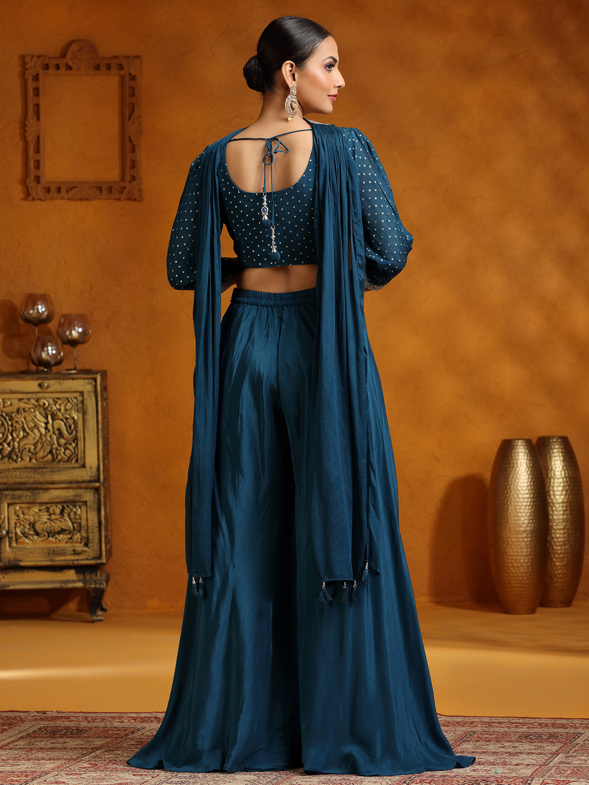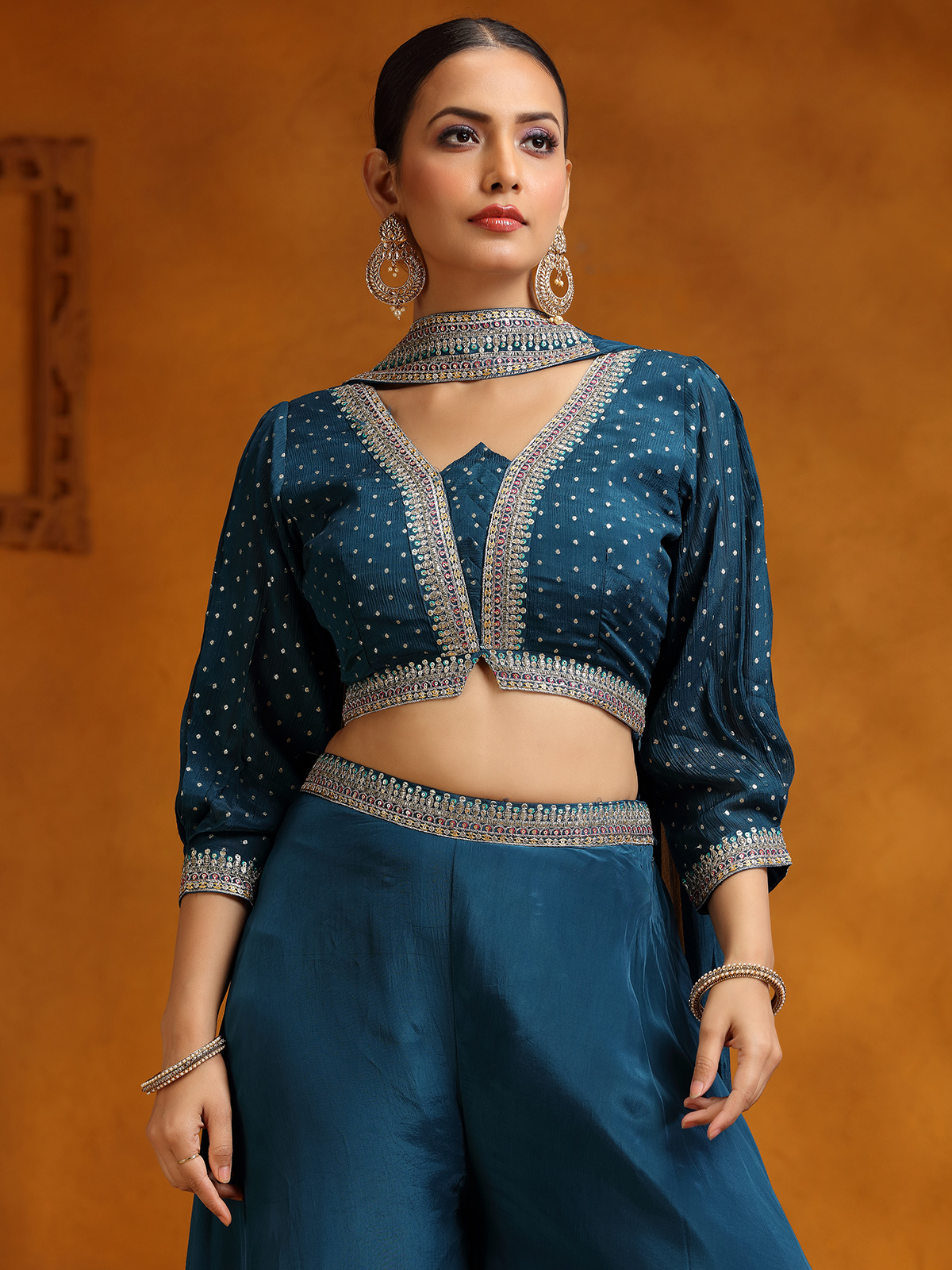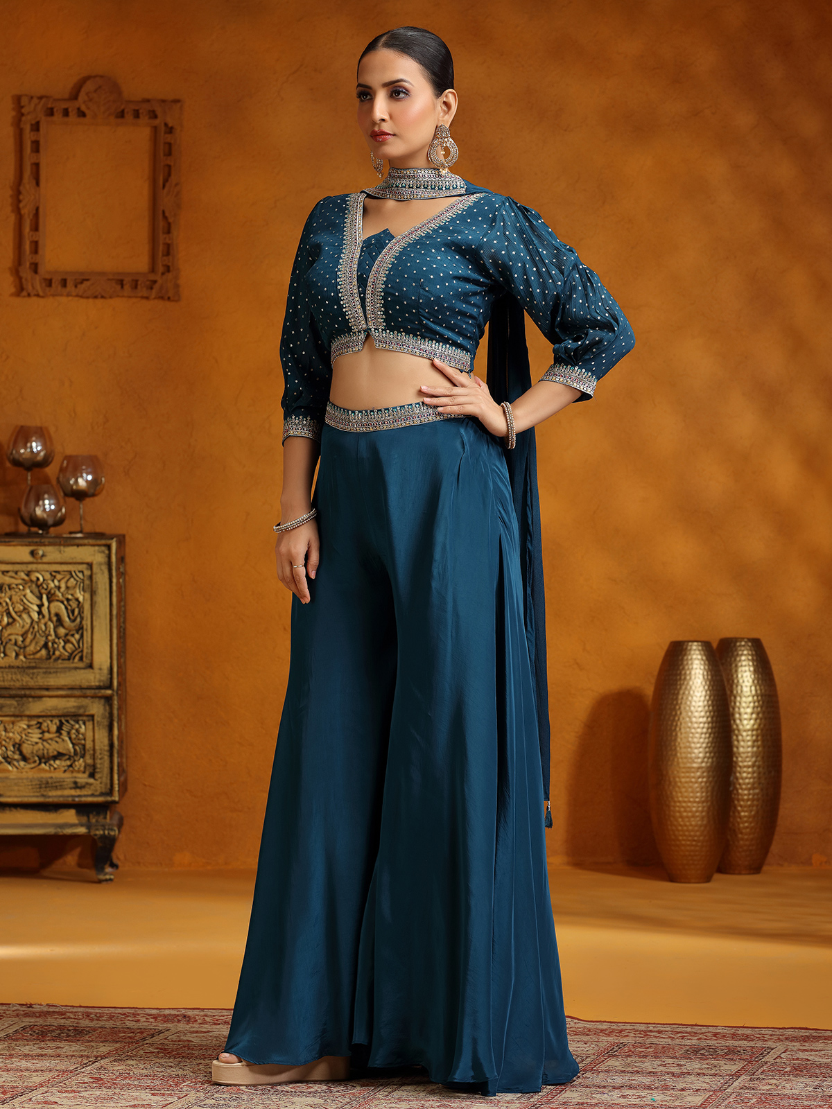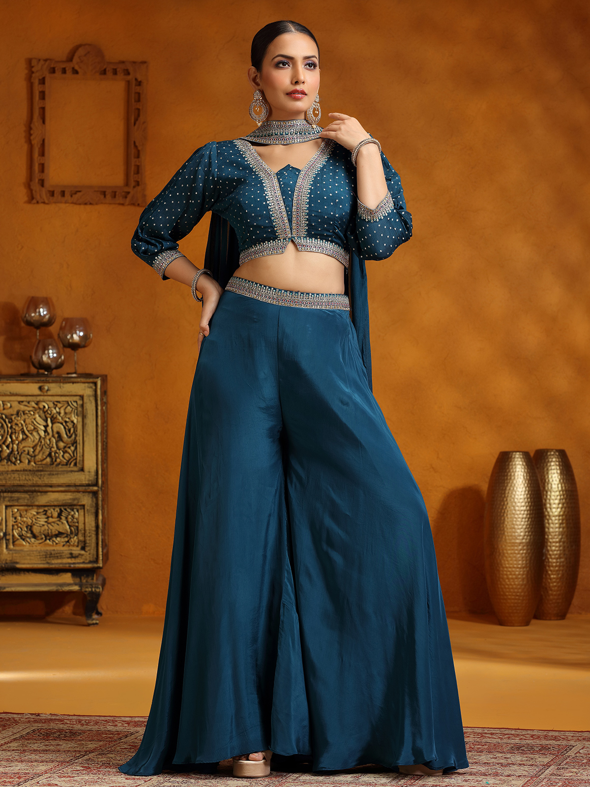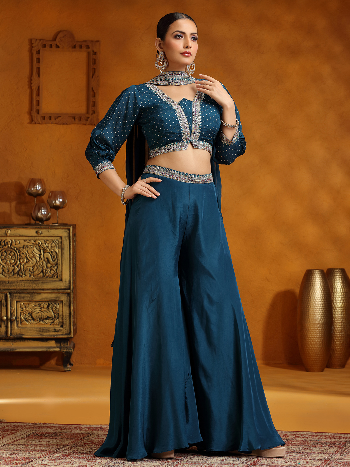 Timeless and elegant, this rama blue satin silk palazzo suit is adorned with rich resham, sequins, thread, and zari work. It features quarter sleeves and is accompanied by a matching dupatta.