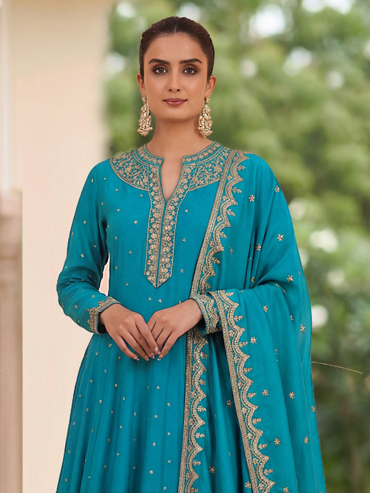 Crafted in rich rama blue silk anarkali suit. Showcases resham and sequin work for refined appeal. Styled with a stand collar and quarter sleeves, it is paired with a dupatta, making it suitable for weddings, sangeet and festive gatherings.