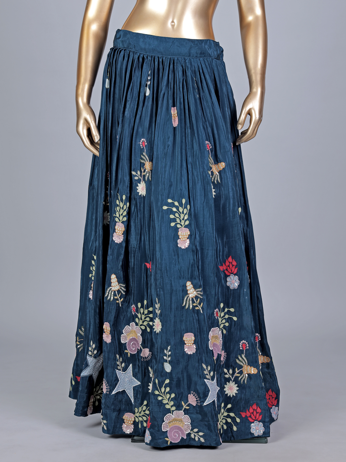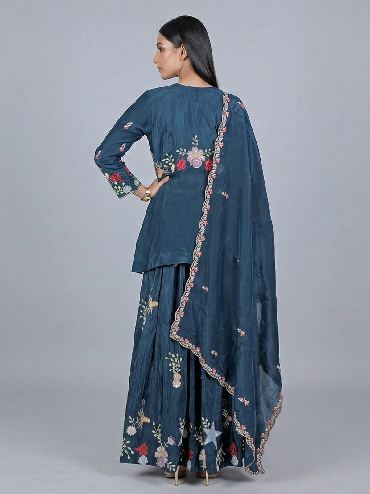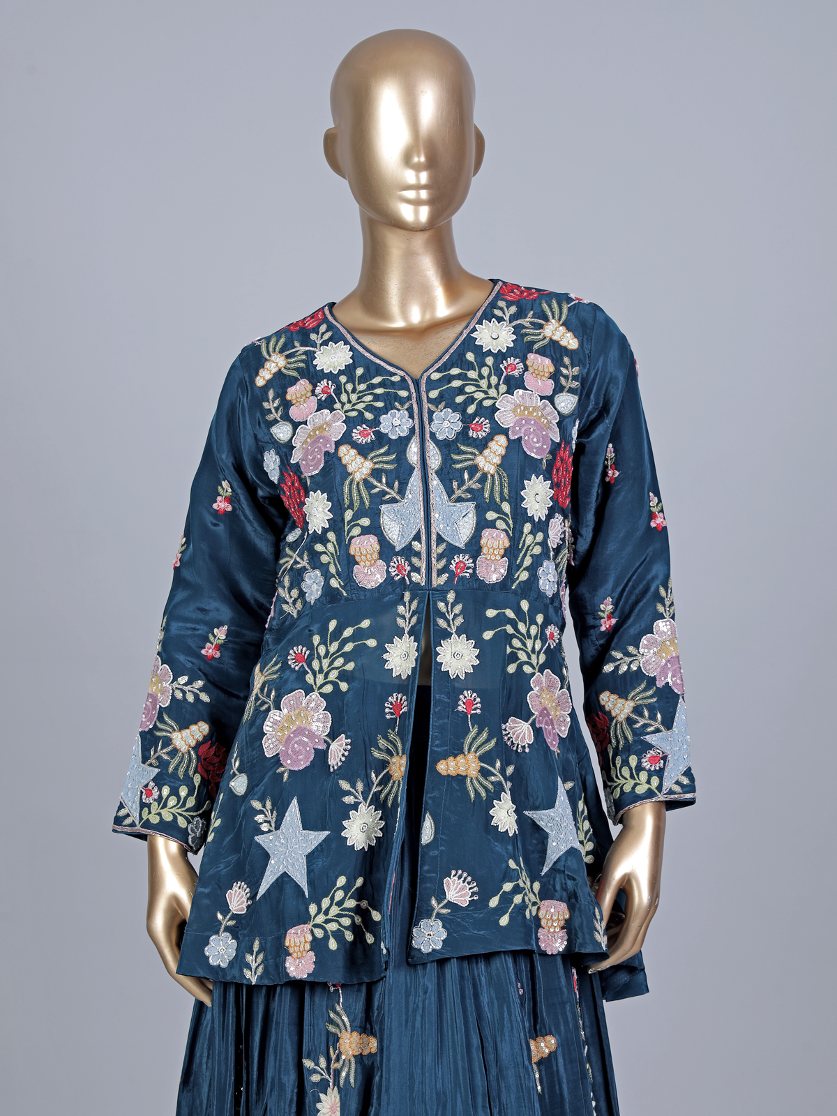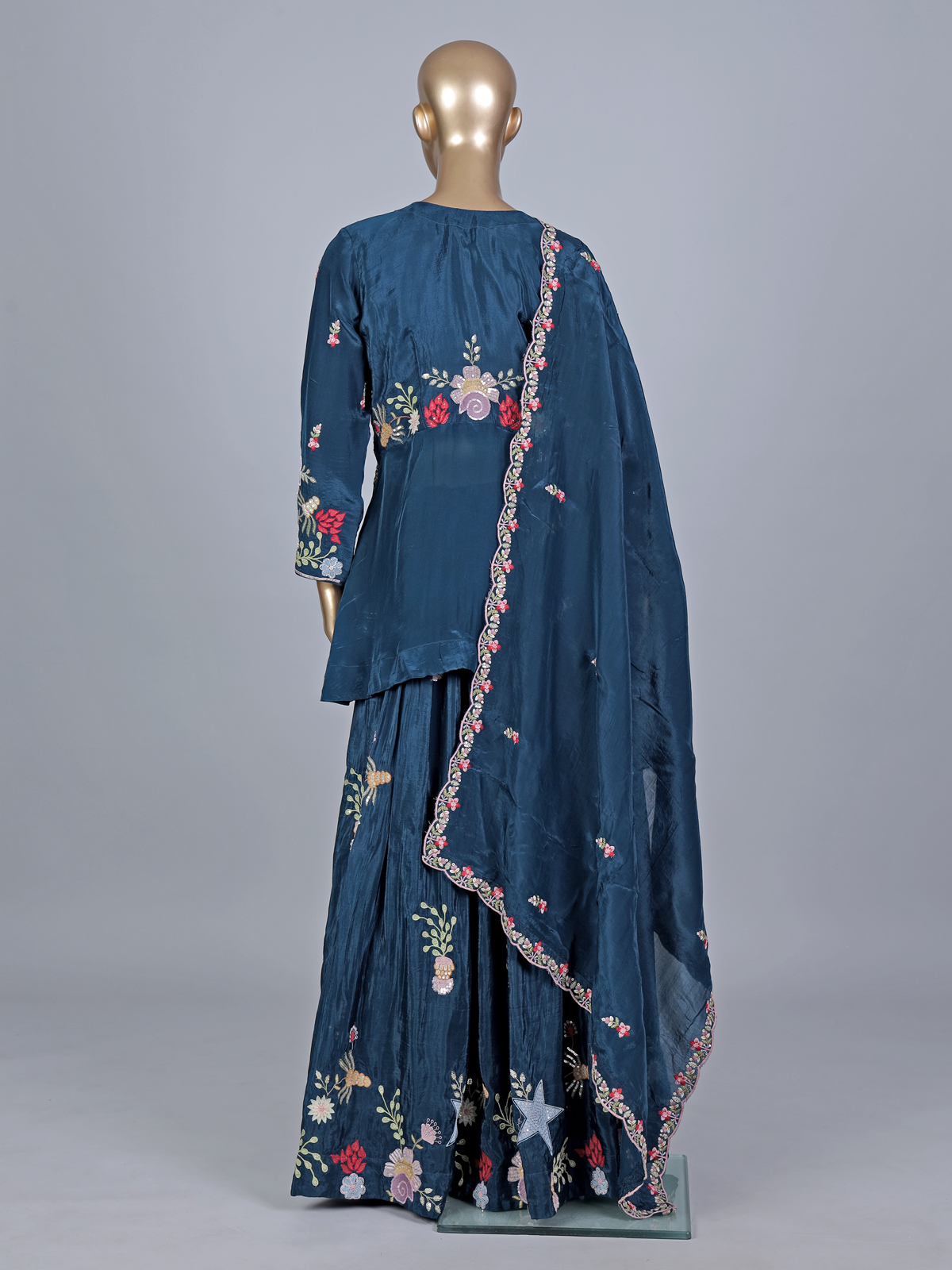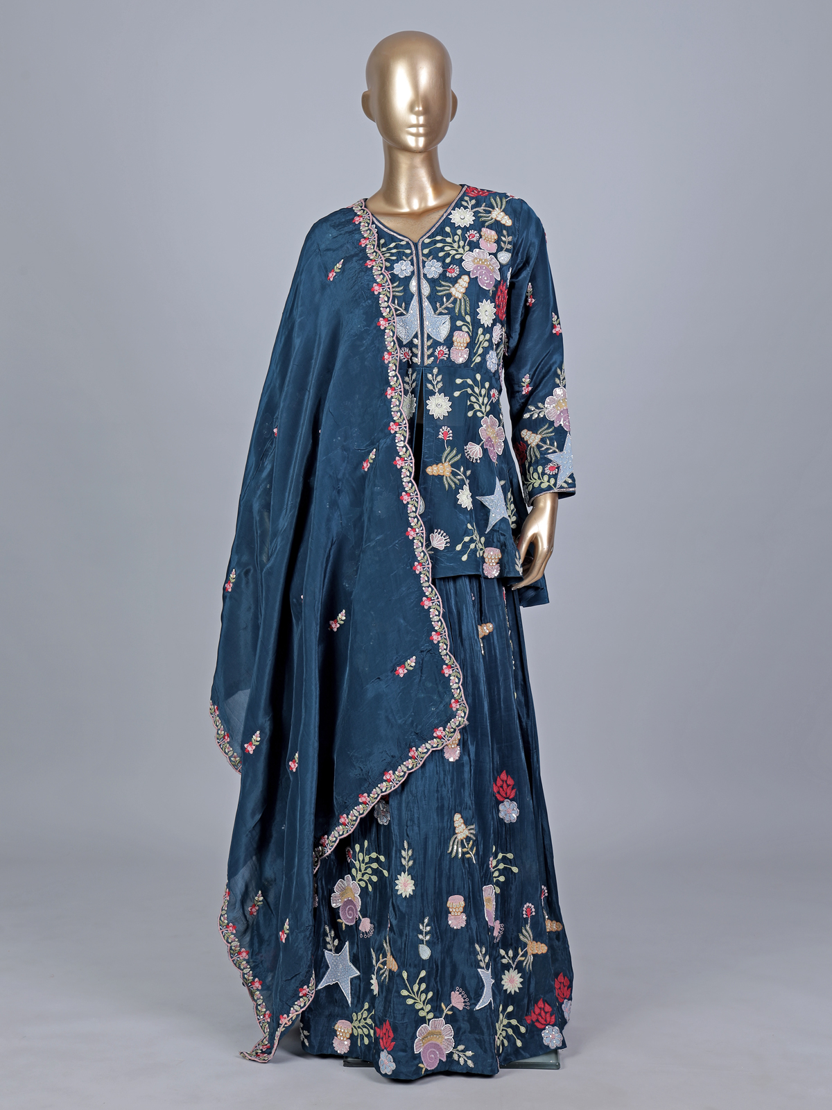 Celebrate regal elegance in this rama blue silk lehenga style ensemble, richly adorned with cutdana, sequins, beads, zardosi and intricate thread work. Designed with a flattering V neckline and full sleeves, it flows gracefully with a dupatta, making it a perfect choice for weddings and festive celebrations.