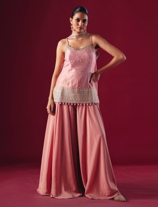 In rich rama green silk, this palazzo suit features striking bandhej prints enhanced with aabla, cutdana, resham and gota detailing. The combination brings a traditional yet festive appeal. Paired with a dupatta, it becomes a vibrant addition to your ethnic wardrobe for joyous celebrations.