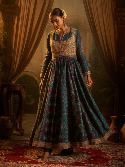 A regal essence blooms in this rama green Patola silk anarkali suit, steeped in grandeur. Printed detailing sparkles with resham and sequins, weaving artistry into tradition. Quarter sleeves and pants form its silhouette, making it a breathtaking choice for weddings and festive occasions filled with cultural richness.