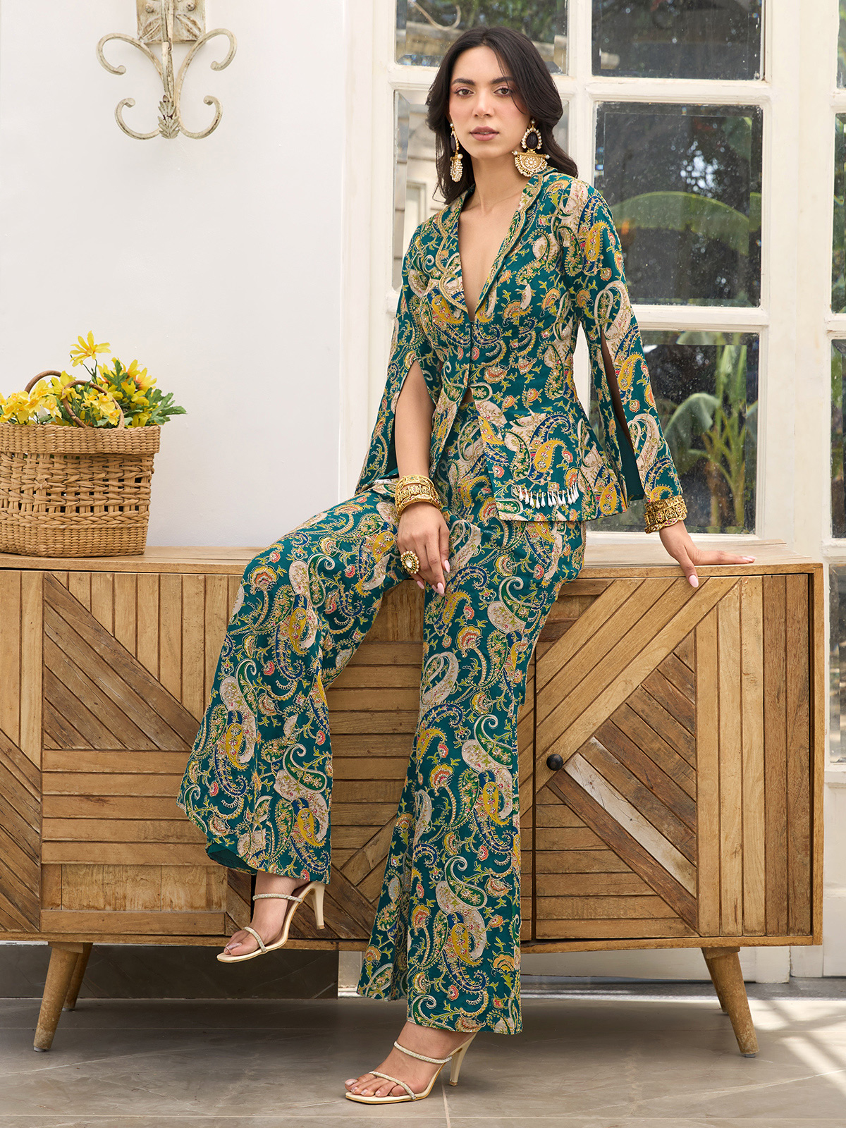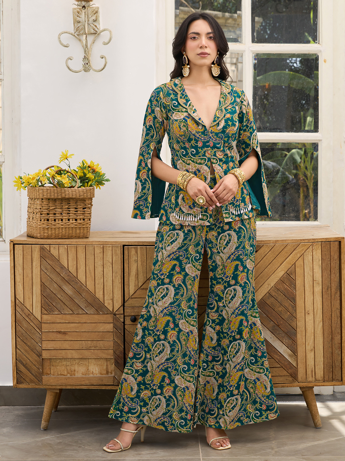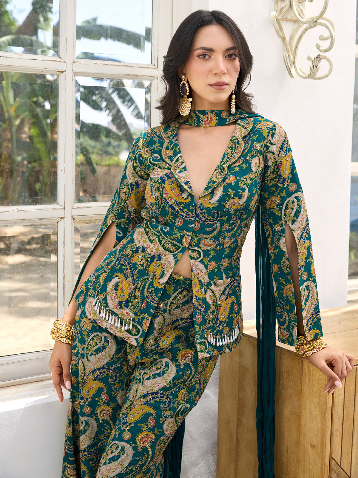 Refined and radiant, this rama green printed suit in soft georgette is a standout for elegant occasions. Adorned with resham, beads, and sequins, and designed with a classic V-neckline, it’s beautifully complemented by a coordinated palazzo and dupatta.