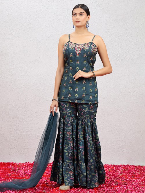 This stunning rama green raw silk sharara salwar suit exudes timeless elegance with its intricate sequins, thread, and resham work, creating a truly captivating design. Perfect for making a statement, it’s a blend of classic beauty and vintage charm. The set is completed with a matching dupatta.