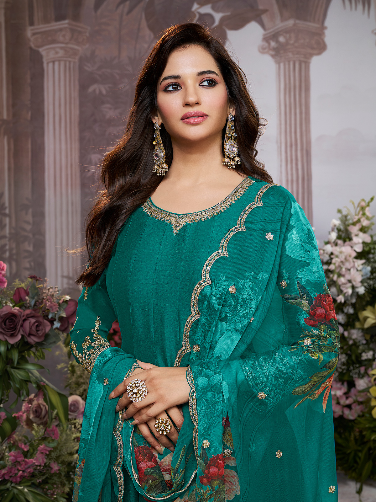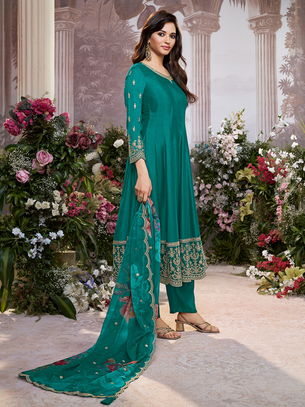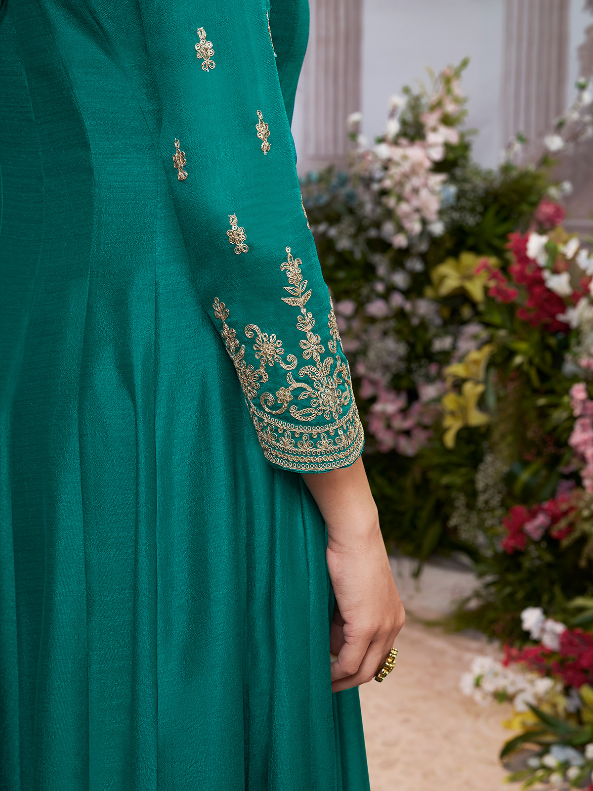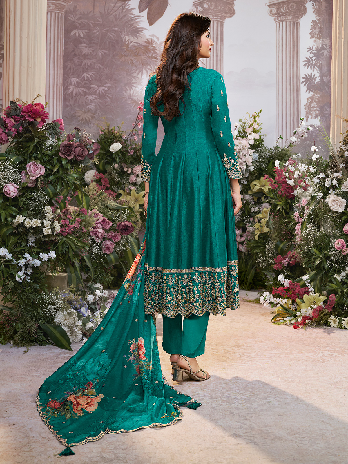 Rama green silk carries festive elegance, detailed with resham, cutdana, and sequins glistening like scattered lights. A round neckline with quarter sleeves lends classic poise. Paired with pant and a printed dupatta, this ensemble is tailored for joyous gatherings where cultural richness blends seamlessly with charm and refinement.