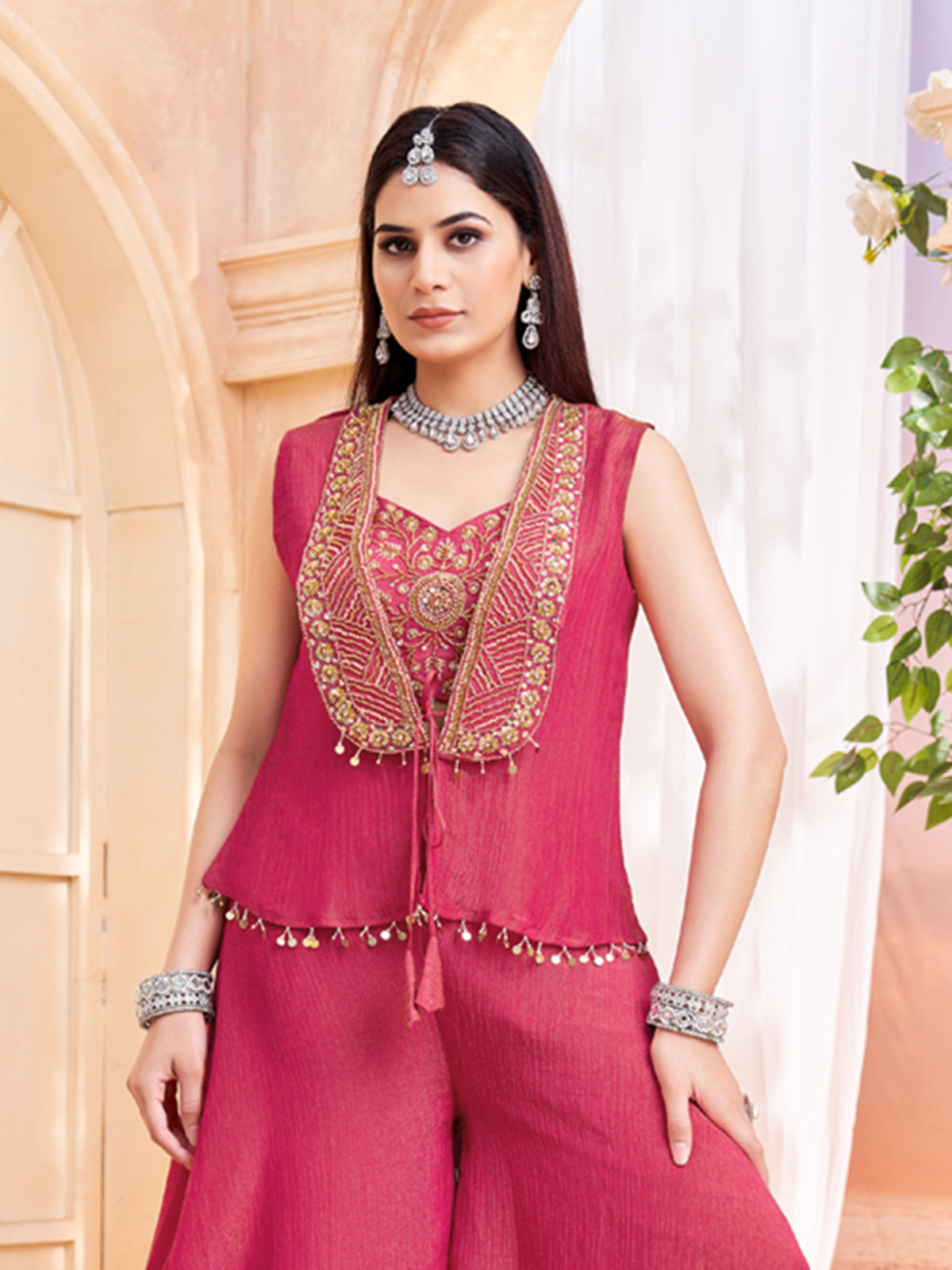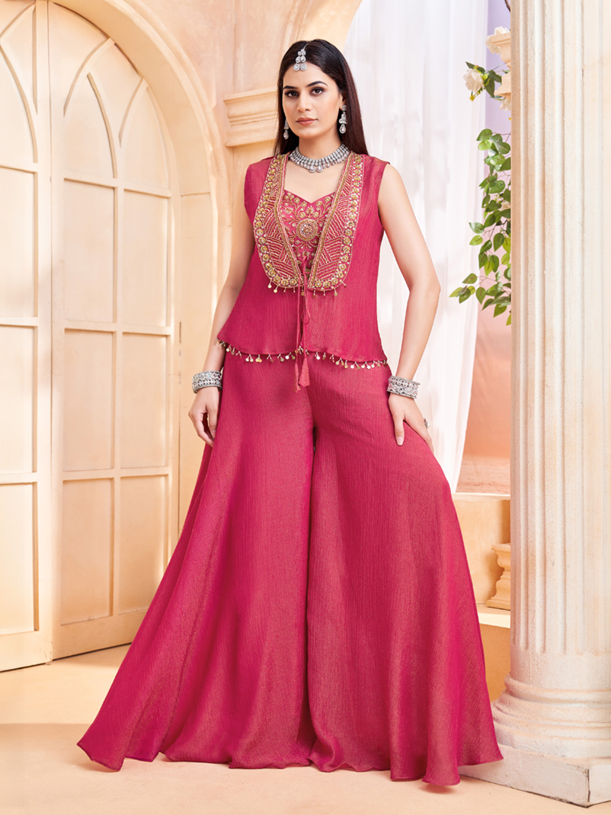 Bold festive beauty shines in this rani pink chiffon designer palazzo suit. The sleeveless jacket style kurti is adorned with cutdana, beads, sequins and mirror embellishments that add dazzling sparkle. Styled with flowing palazzo bottoms, the ensemble creates a contemporary layered silhouette perfect for weddings, receptions and joyous sangeet celebrations.