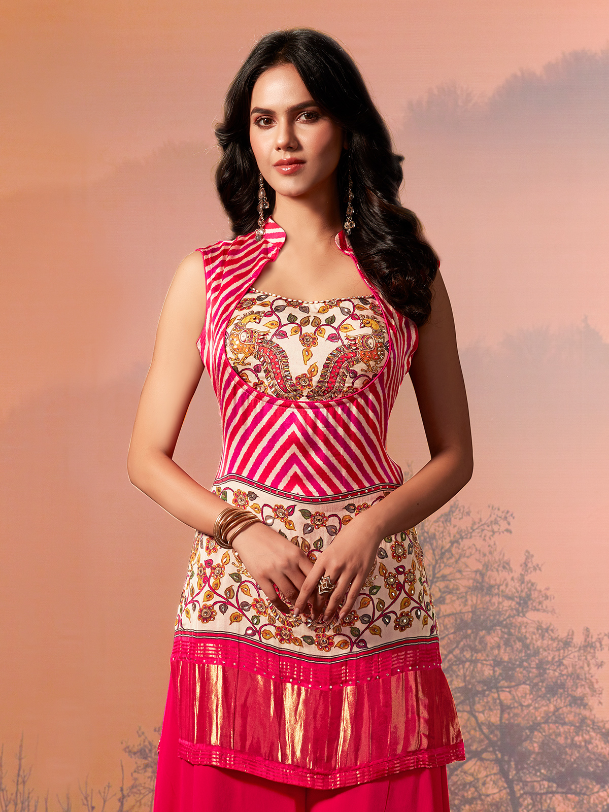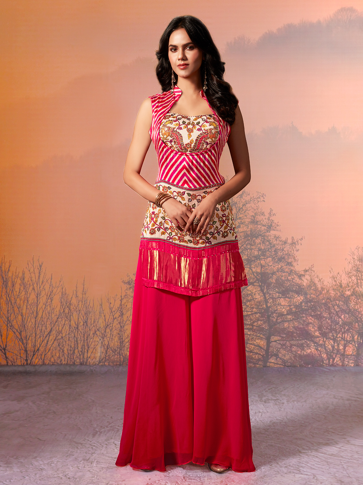 This rani pink georgette silk palazzo suit. Features striking printed detailing enriched with sequins, stone and zari highlights. Designed with a structured collar neckline and sleeveless blouse, it balances festive vibrance with elegance. Finished with a palazzo bottom, it is ideal for weddings, receptions and stylish festive occasions.