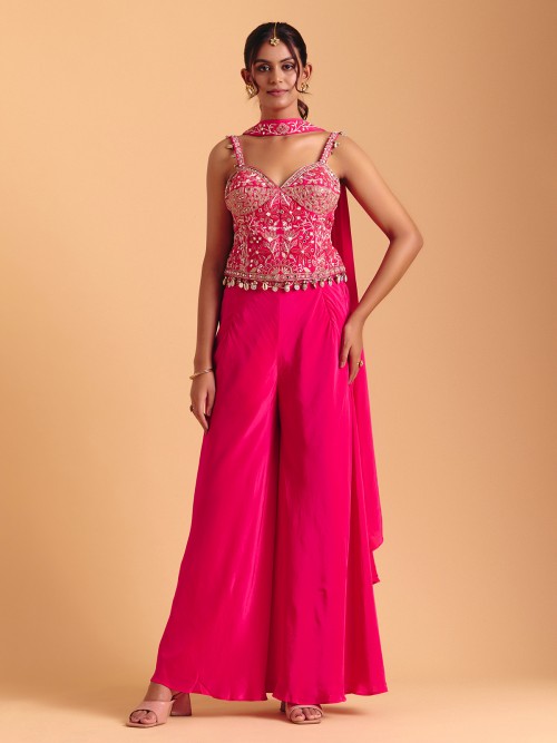 A radiant rani pink satin silk palazzo suit enriched with sequins, embroidery, resham, aabla, cutdana, coins and cowrie accents. The sleeveless sweetheart neckline and dupatta complete a bold, festive ensemble for weddings and receptions.