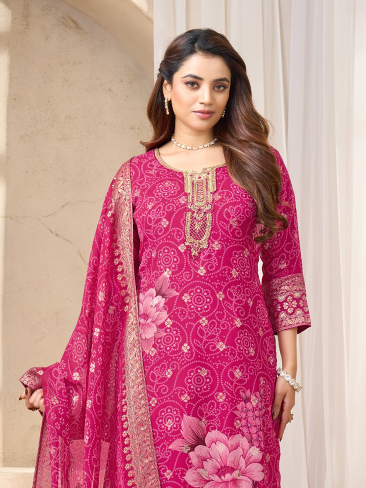 Bright festive tones illuminate this rani pink silk bandhej printed salwar suit. Designed with a flattering sweetheart neckline and quarter sleeves. The kurti sparkles with thread, sequins, beads and zari embellishments. Paired with tailored pants and a graceful dupatta, the ensemble creates a lively ethnic look perfect for festive celebrations and joyful occasions.