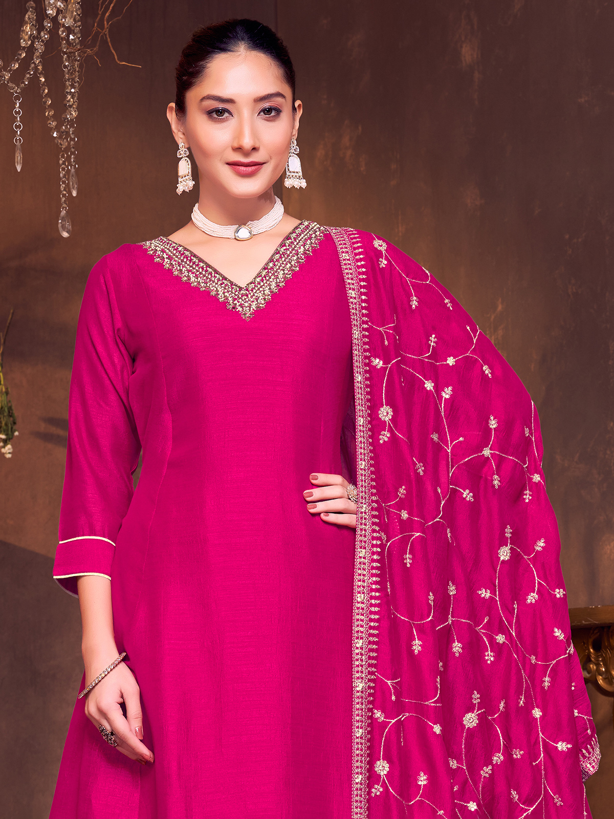 Turn heads in this striking rani pink silk salwar suit. Enhanced with delicate aabla, resham, sequins, and beads, it features a flattering V-neckline and quarter sleeves. Teamed with pant and dupatta, it embodies festive radiance and wedding grandeur, making it a statement piece for women who admire refined ethnic artistry.
