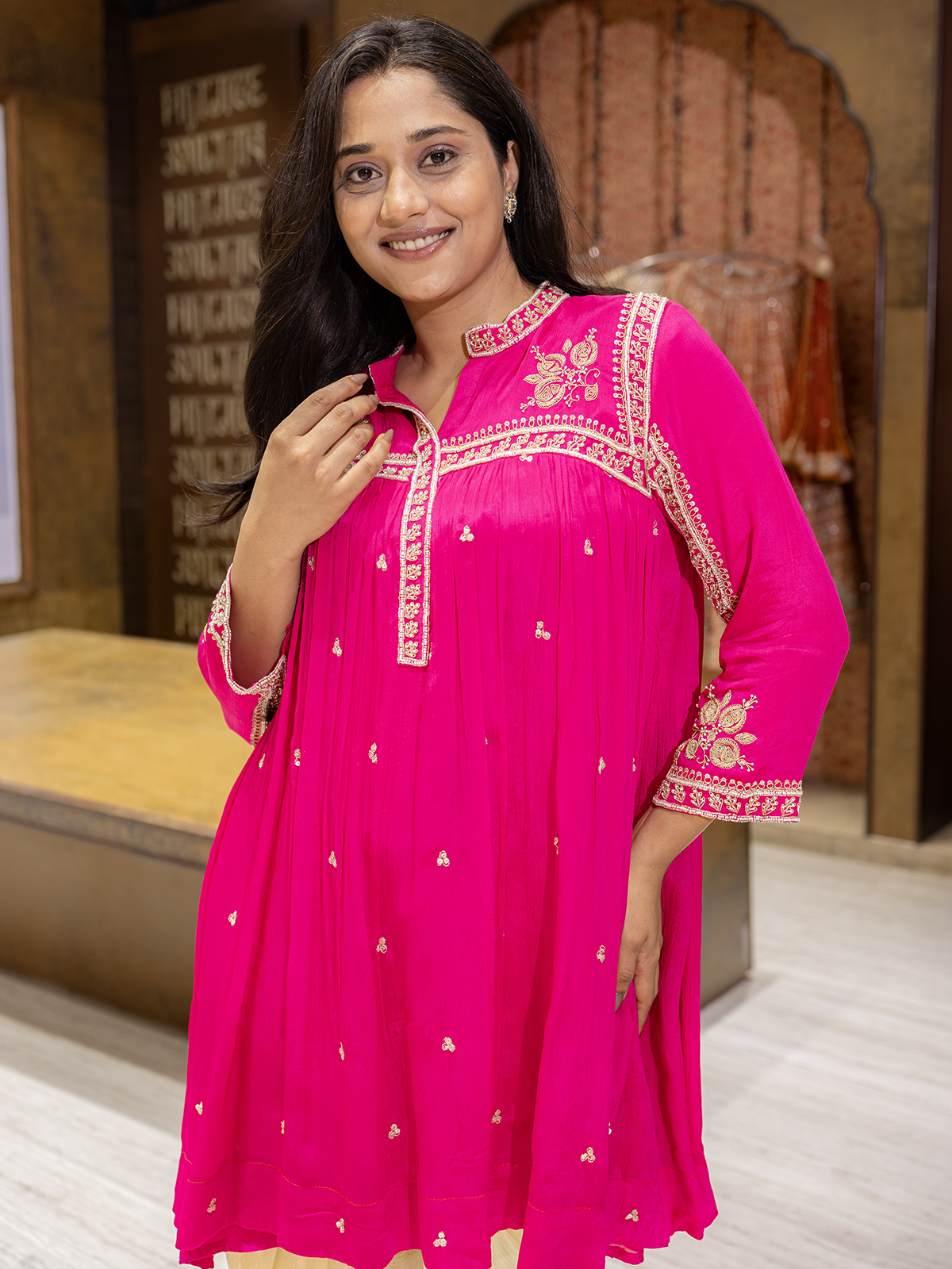 Designed for festive elegance, the pink dhoti suit in rich and chinning silk features finely crafted sequins, cutdana, zardosi and beads details. A flattering stand collar and quarter sleeves with stylish dhoti give it a refined look, perfect for joyful gatherings.