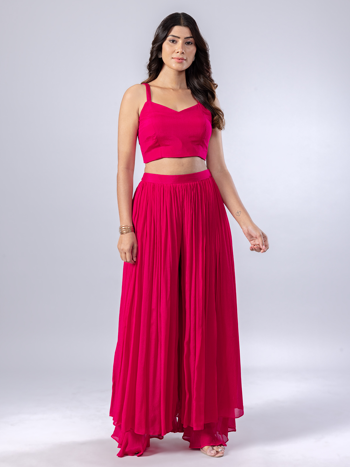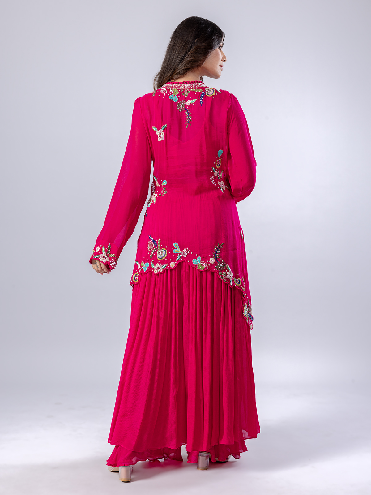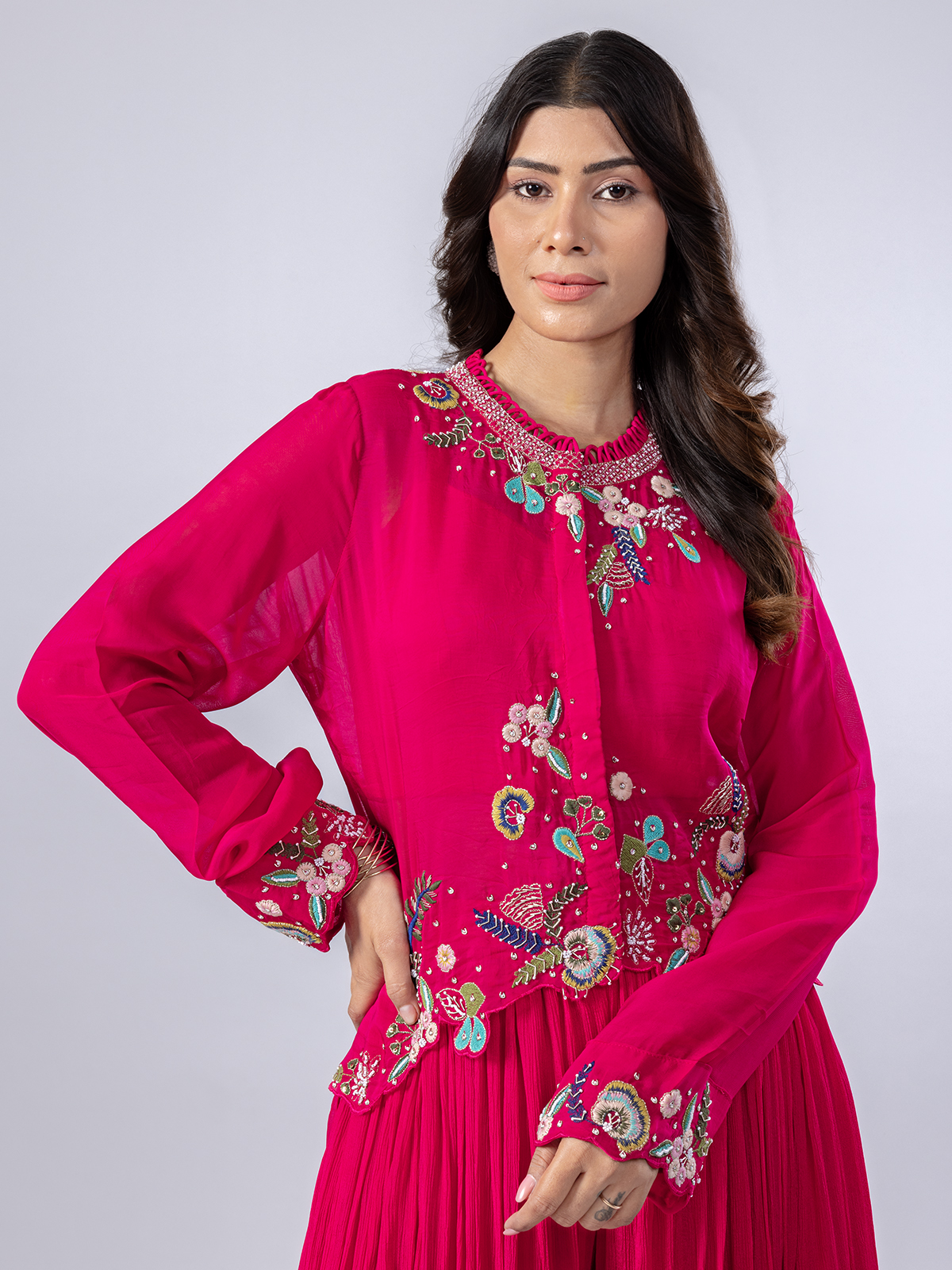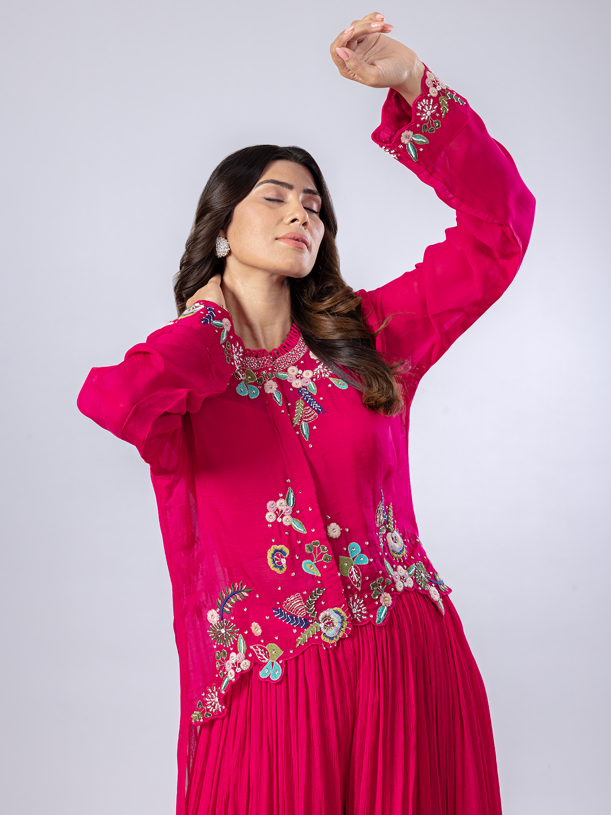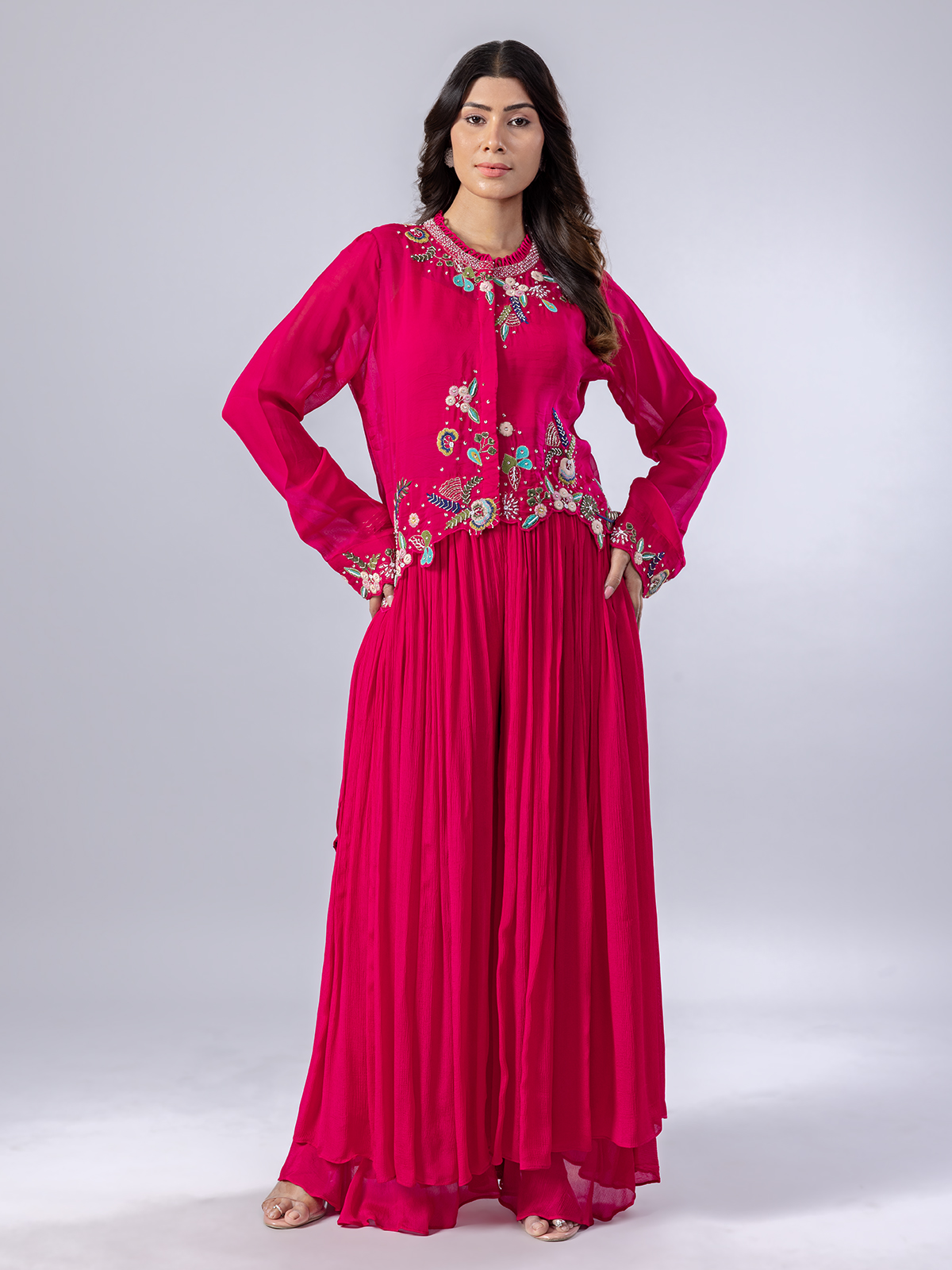 Turn heads in this rani pink silk palazzo suit, adorned with thread, beads, cutdana, sequins, and zardosi embroidery. The stylish jacket enhances its richness, offering a blend of sophistication and comfort. Perfect for festive or wedding celebrations, this ensemble is a radiant choice for the modern woman with traditional elegance.
