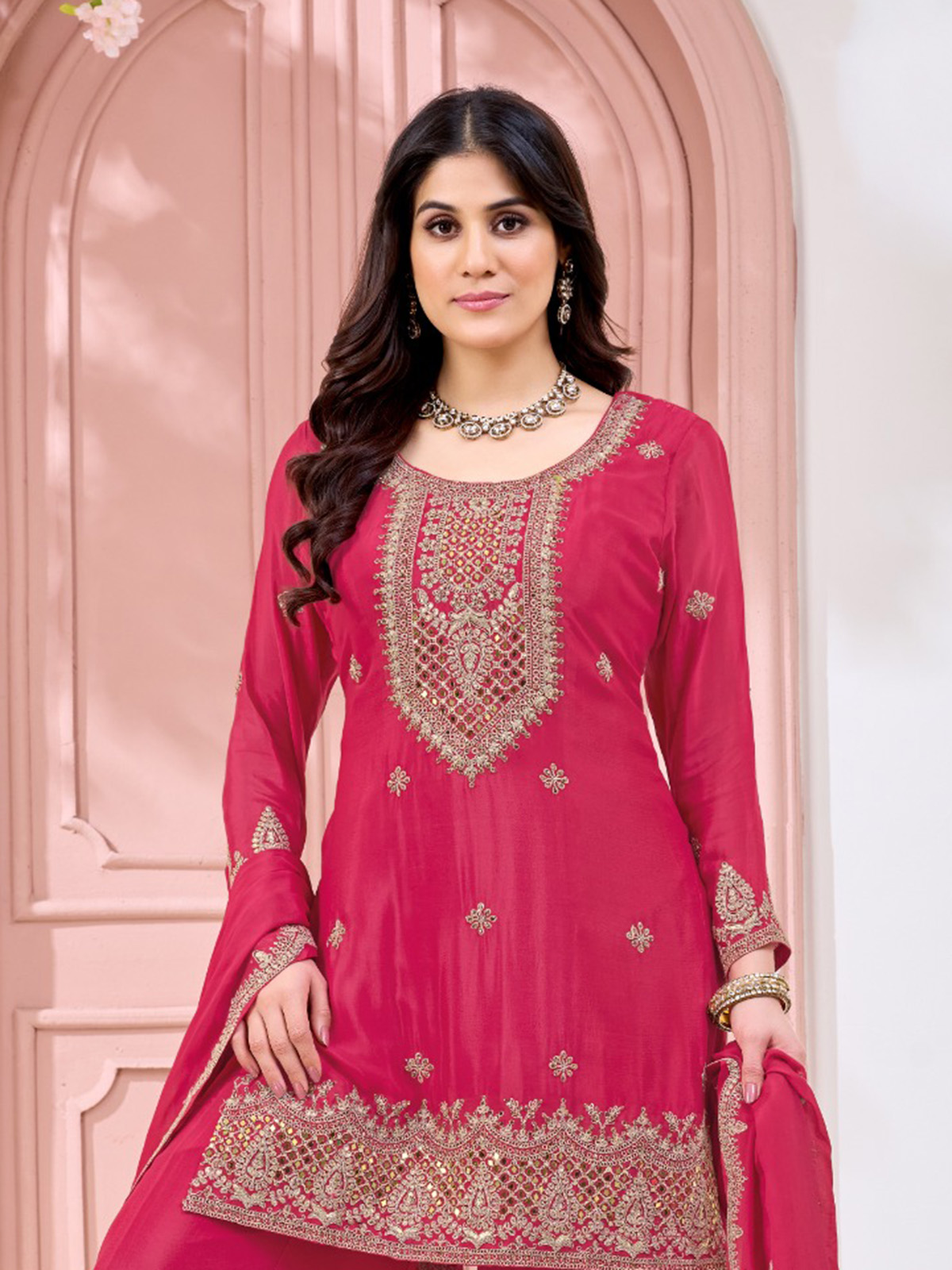 Classic festive beauty shines through this rani pink silk pakistani style palazzo suit. The kurti features a graceful round neckline with full sleeves and a refined yoke design. Enhanced with thread, sequins, mirror and bead embellishments. Styled with flowing palazzo bottoms and a soft dupatta, the ensemble creates an elegant traditional look perfect for weddings and festive gatherings.