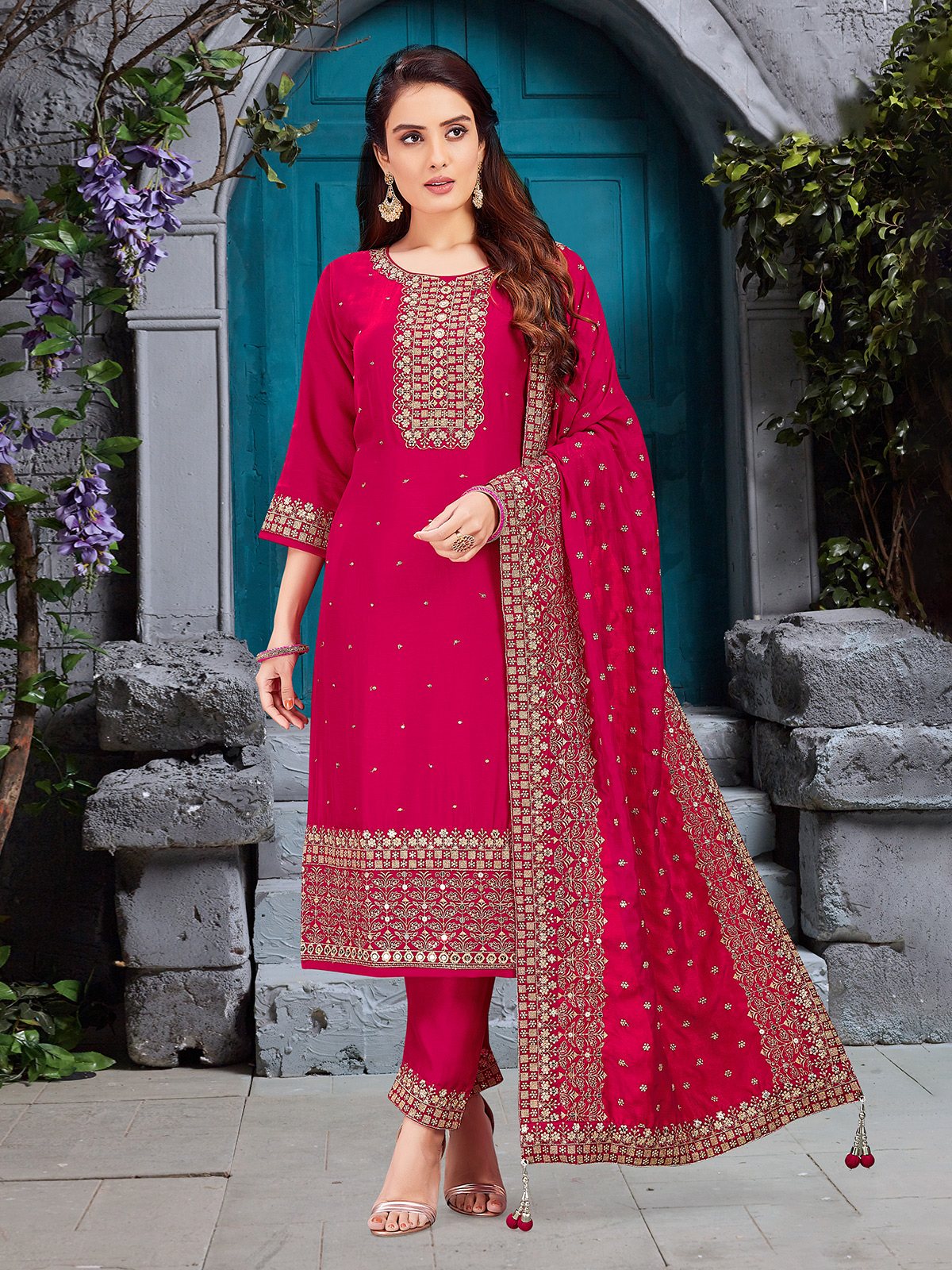 Celebrate in style with this rani pink silk salwar suit, intricately designed with resham and sequins work. Featuring a round neckline and quarter sleeves, it is paired with a dupatta and pant. A lively wedding and festive outfit that combines vibrant charm with traditional artistry.