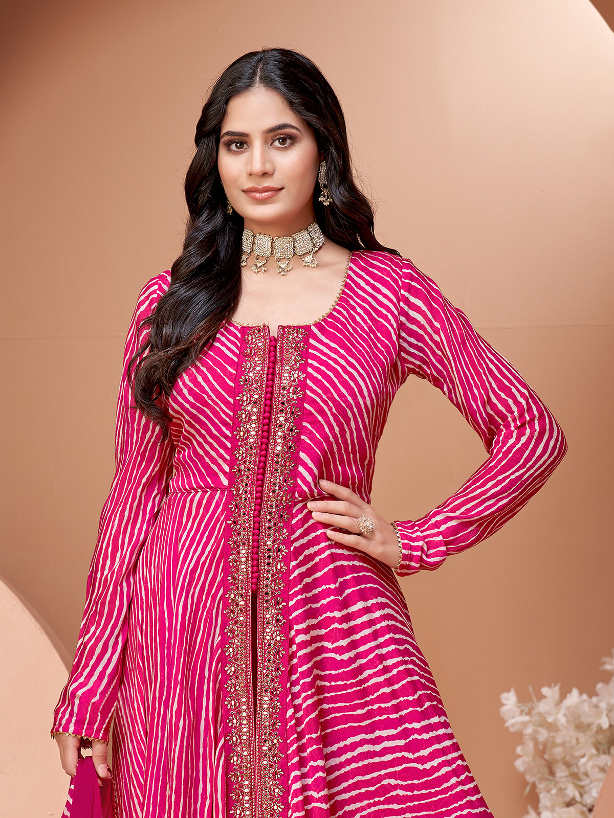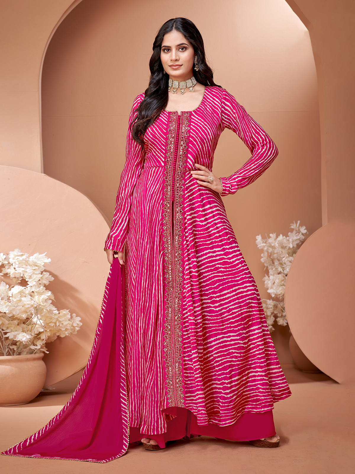 This rani pink silk palazzo suit enchants with dazzling aabla, cutdana, and sequins. Its printed dupatta adds a joyful edge, while full sleeves and a round neckline complete the refined silhouette. A radiant pick for festive evenings, Diwali gatherings, and elegant wedding functions.
