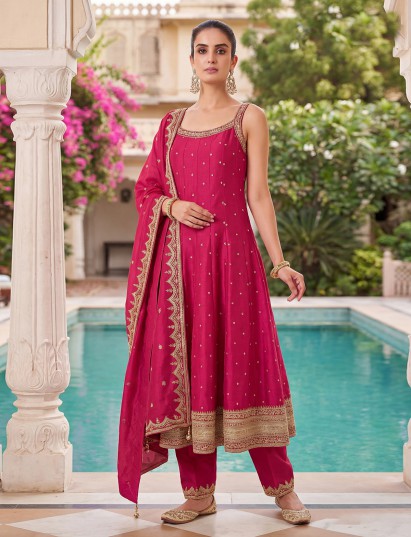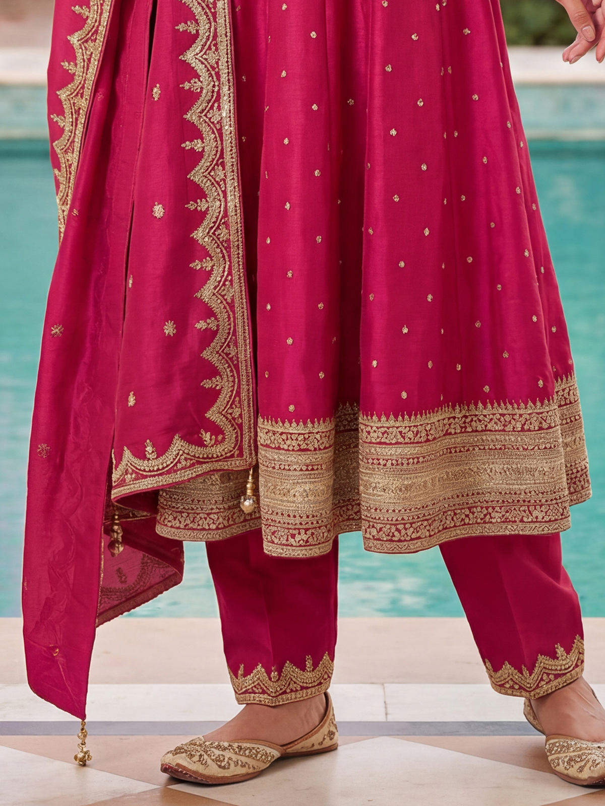Designed in striking rani pink silk anarkali suit is highlighted with resham and sequins for vibrant charm. Featuring a round neckline and sleeveless cut, it is paired with pants and a dupatta, ideal for weddings, sangeet and festive evenings.