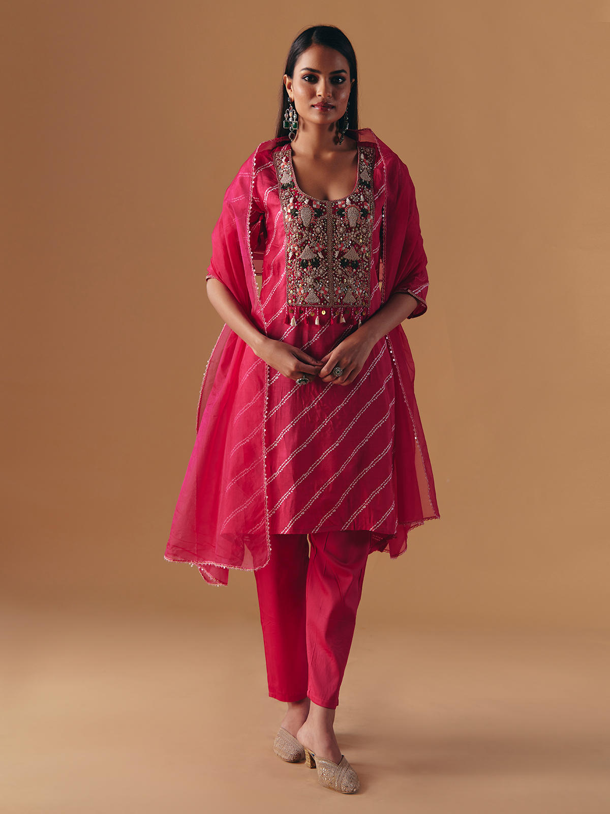 Rani Pink Silk Yoke Style Pant Suit With Dupatta