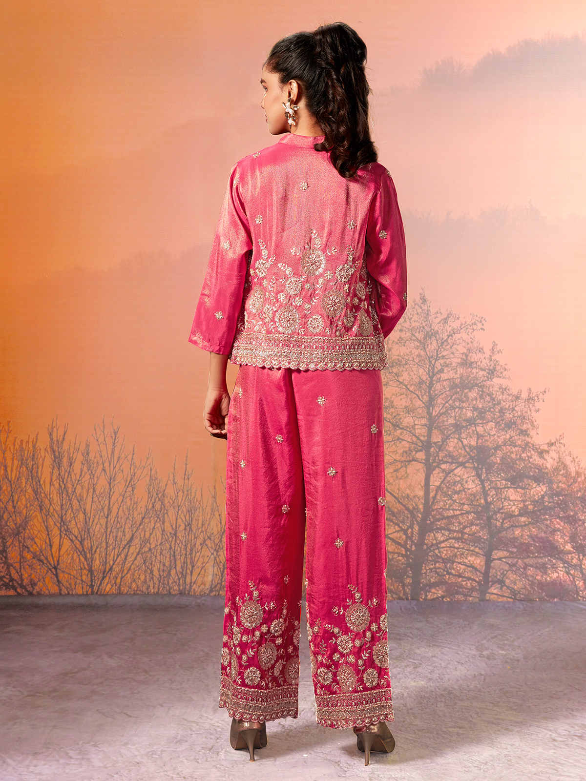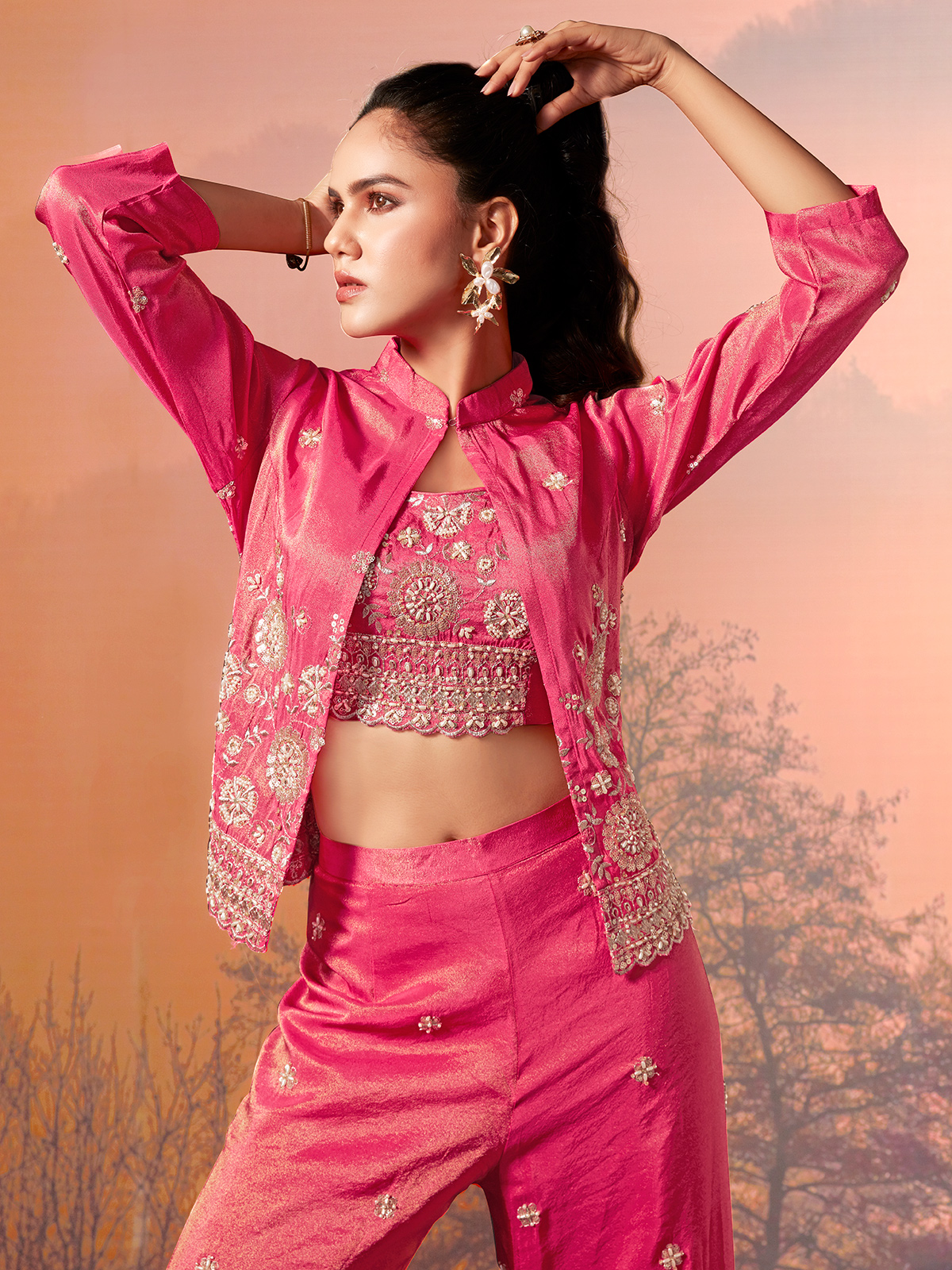 Crafted in rich rani pink tissue silk designer palazzo suit. Features a jacket style silhouette adorned with embroidery, sequins, cutdana and pearl detailing. The layered look adds regal charm, while the palazzo ensures comfort, making it ideal for weddings, receptions and grand festive occasions.