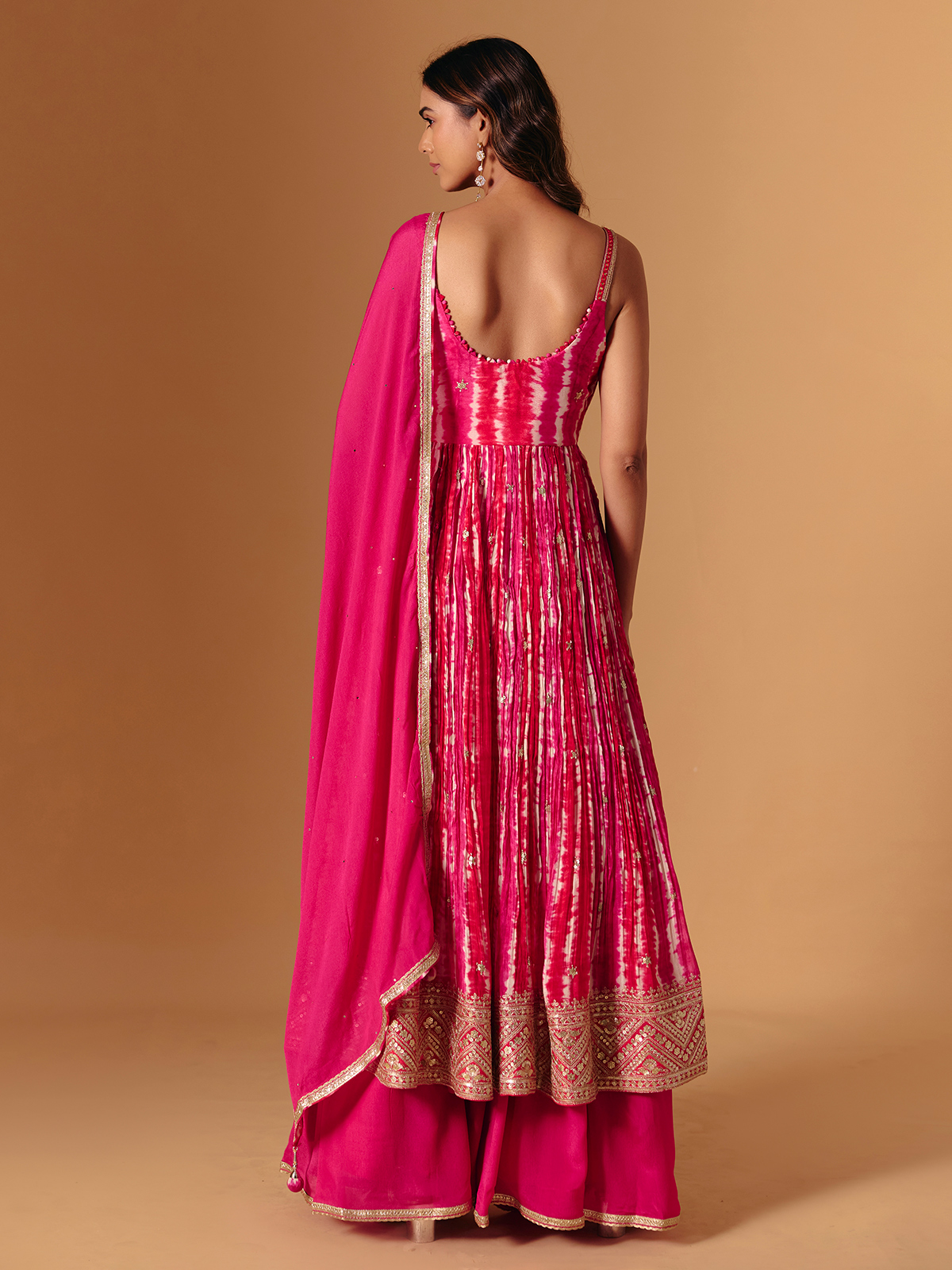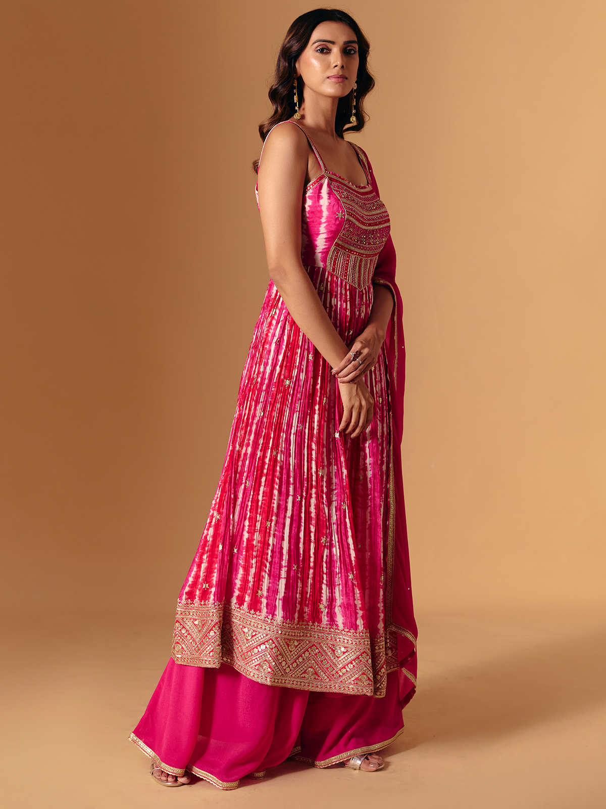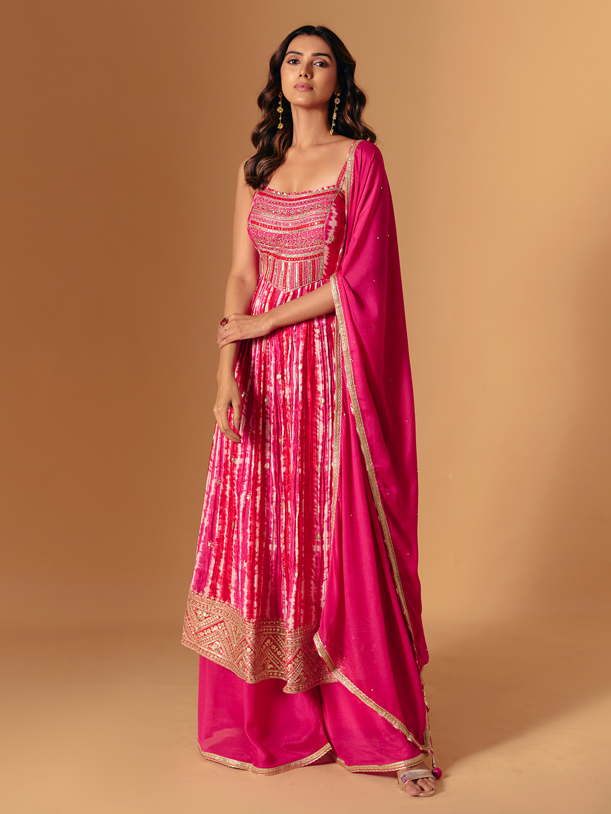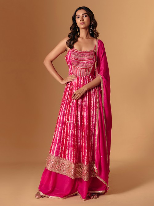 Crafted in rich rani pink silk, this palazzo suit radiates charm with embroidery, zardosi, and aabla accents. The square neckline and printed dupatta make it a showstopper—perfect for festive evenings that echo elegance and glamour.