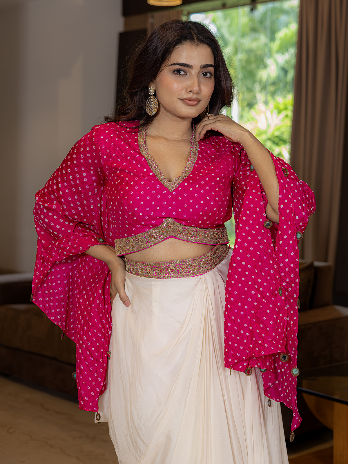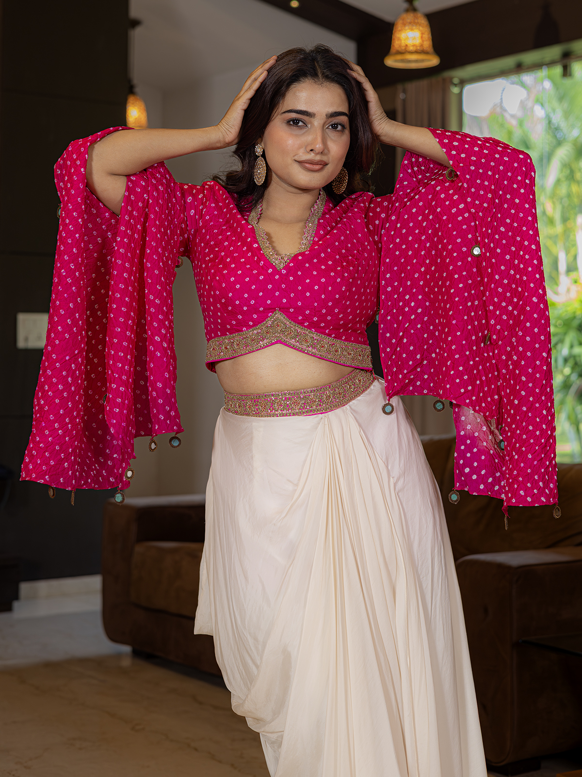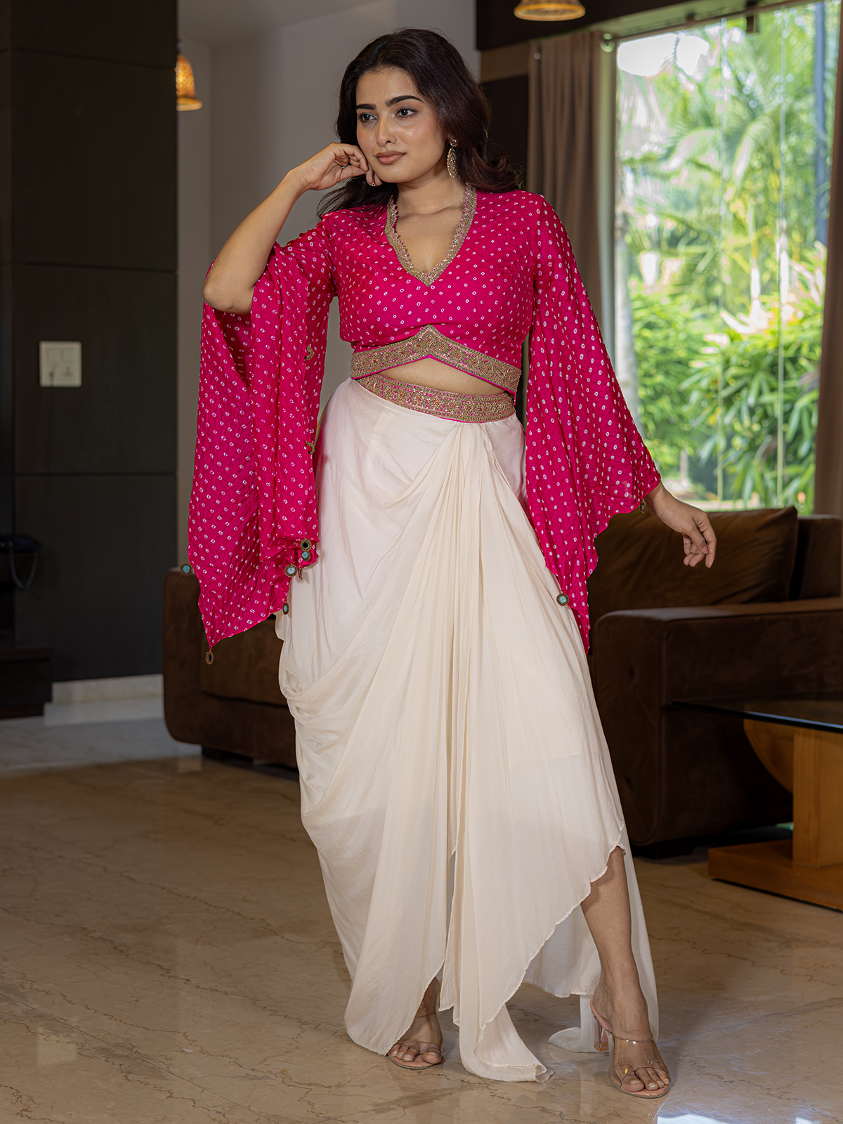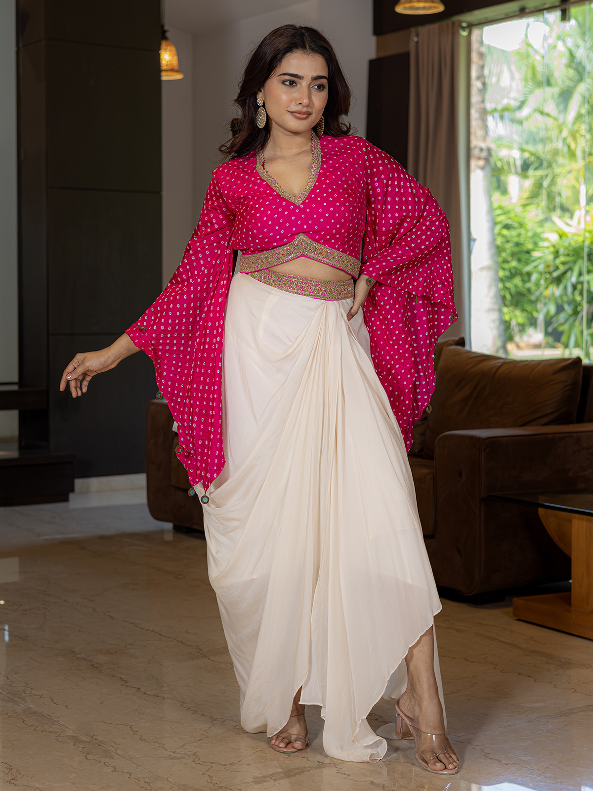 Vibrant and luxurious, this rani silk Indo-western set glows with cutdana, sequins, beads, and zari embellishments. The fusion of rich fabric and modern print gives it a contemporary royal appeal perfect for weddings, receptions, and sangeet soirées that call for effortless glamour.