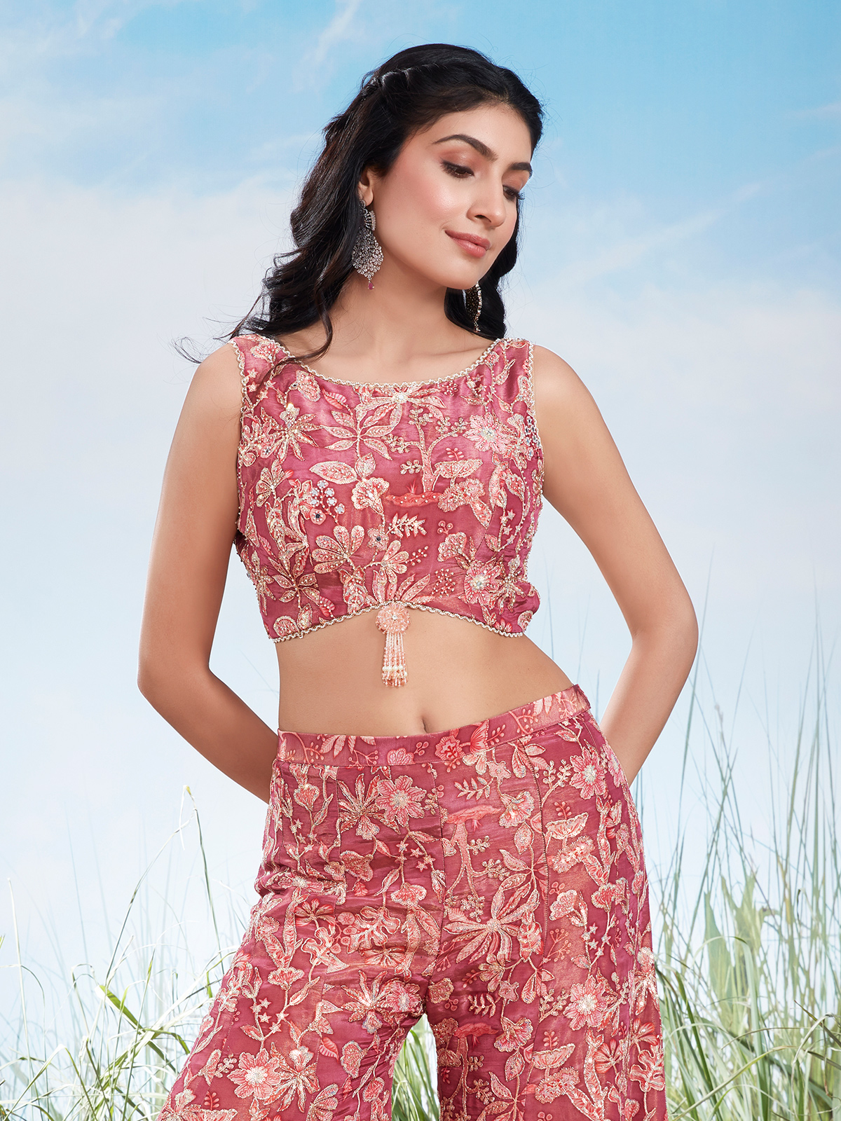 Crafted in luxurious raspberry pink chinon silk, this printed palazzo suit features resham, cutdana and sequins embroidery that adds graceful sparkle. The soft fabric drapes effortlessly, creating a flattering festive look. Ideal for weddings, receptions, sangeet, cocktail events and stylish party wear celebrations.