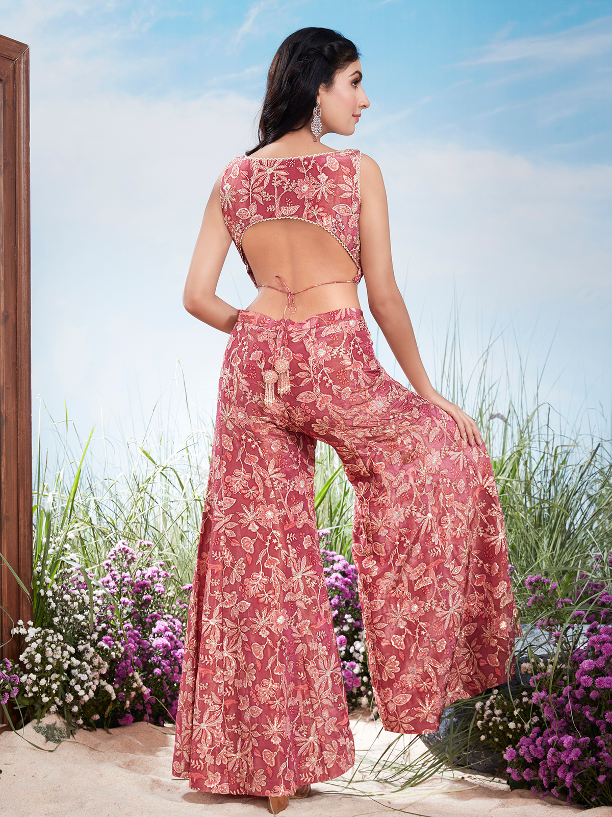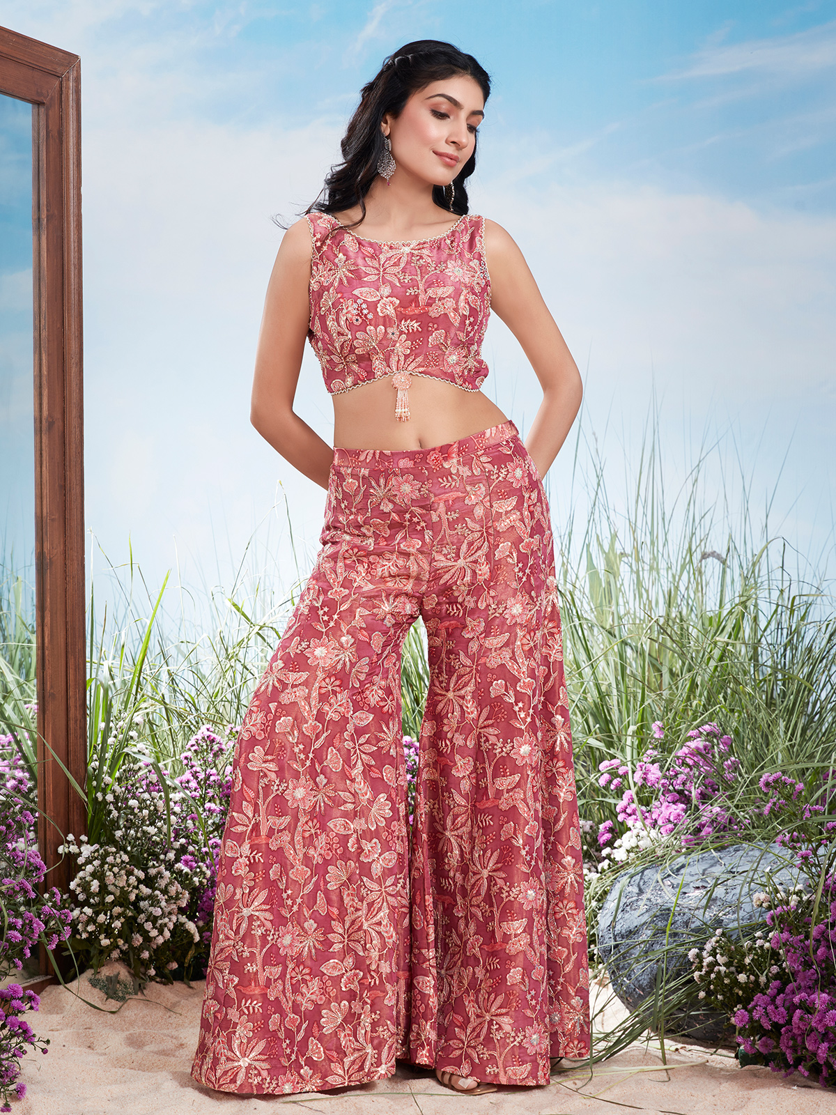 Raspberry Pink Printed Chinon Silk Palazzo Suit