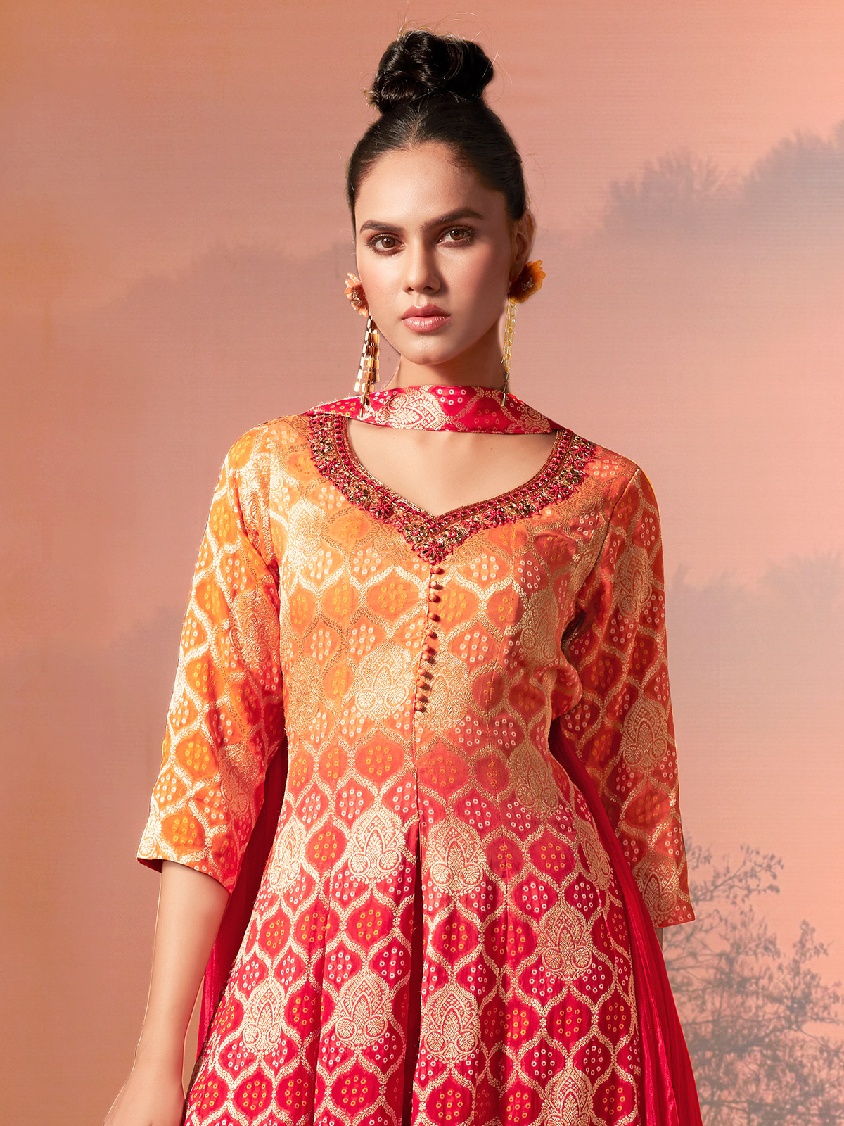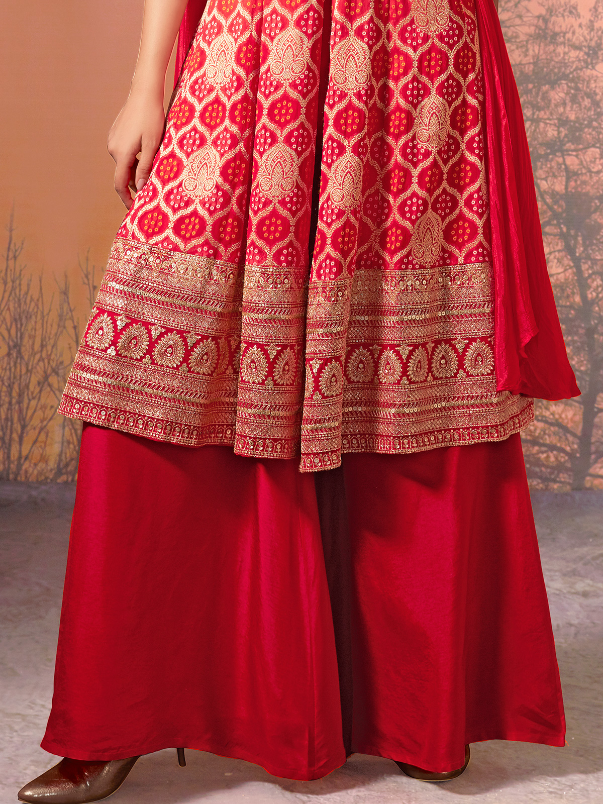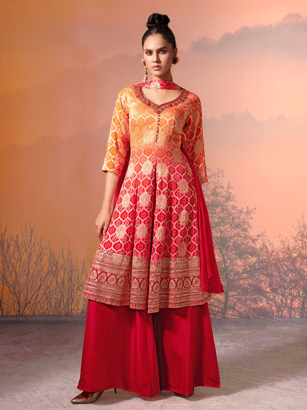 Red And Orange Bandhej Printed Silk Palazzo Suit