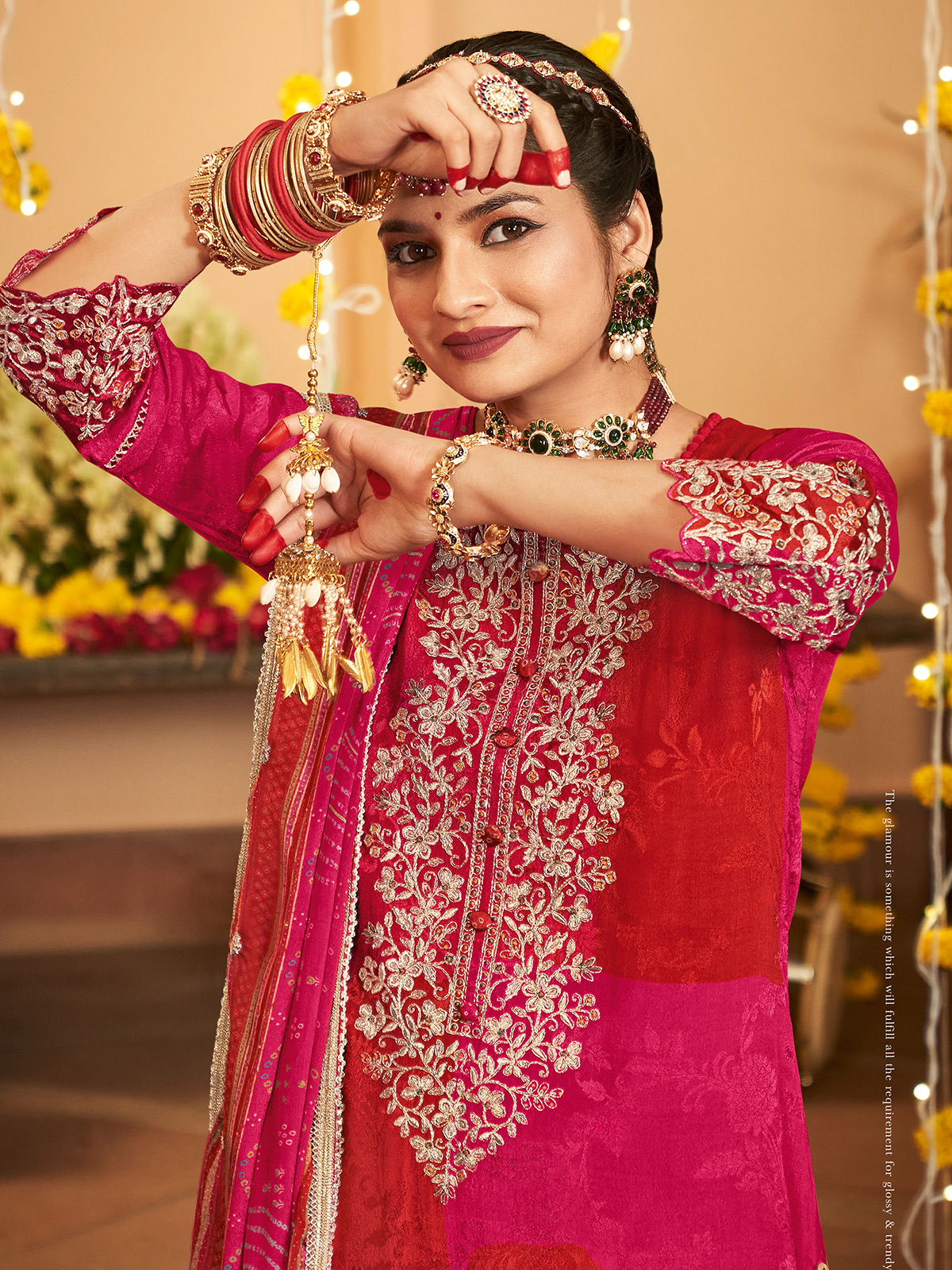 In a blend of soft red and pink, this organza suit features intricate resham embroidery. The round neck and quarter sleeves add to the traditional appeal, paired with a tailored pant and a striking printed dupatta.