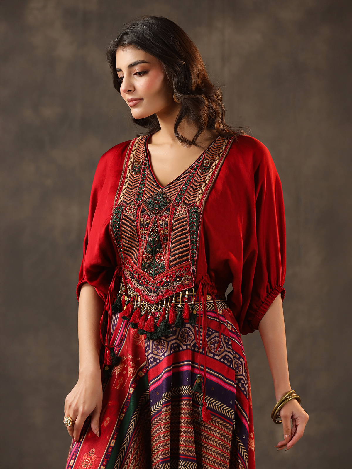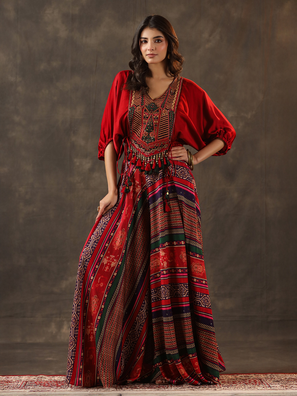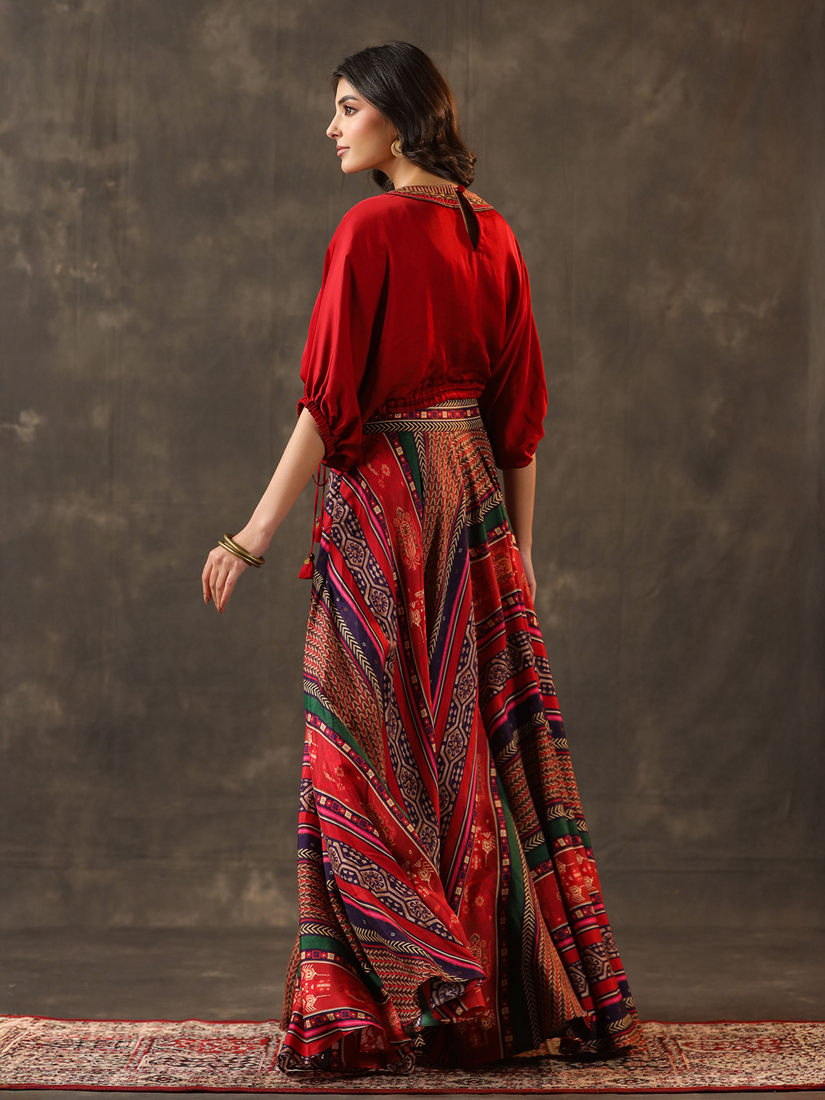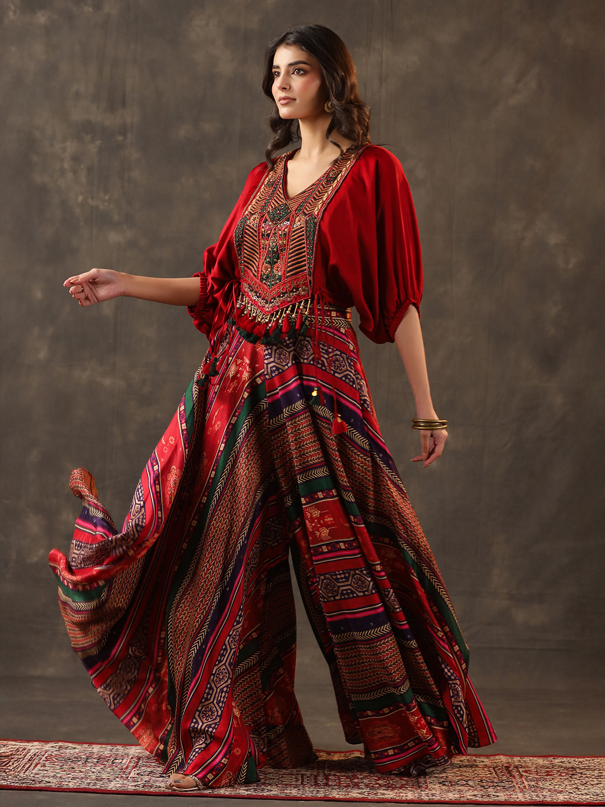 Vibrant red tones enrich this crepe silk palazzo suit crafted for festive elegance. Enhanced with embroidery, sequins, beads, cutdana and pearl work. It radiates rich detail. The V neckline and quarter sleeves add sophistication. While the palazzo bottom ensures a graceful and modern silhouette.