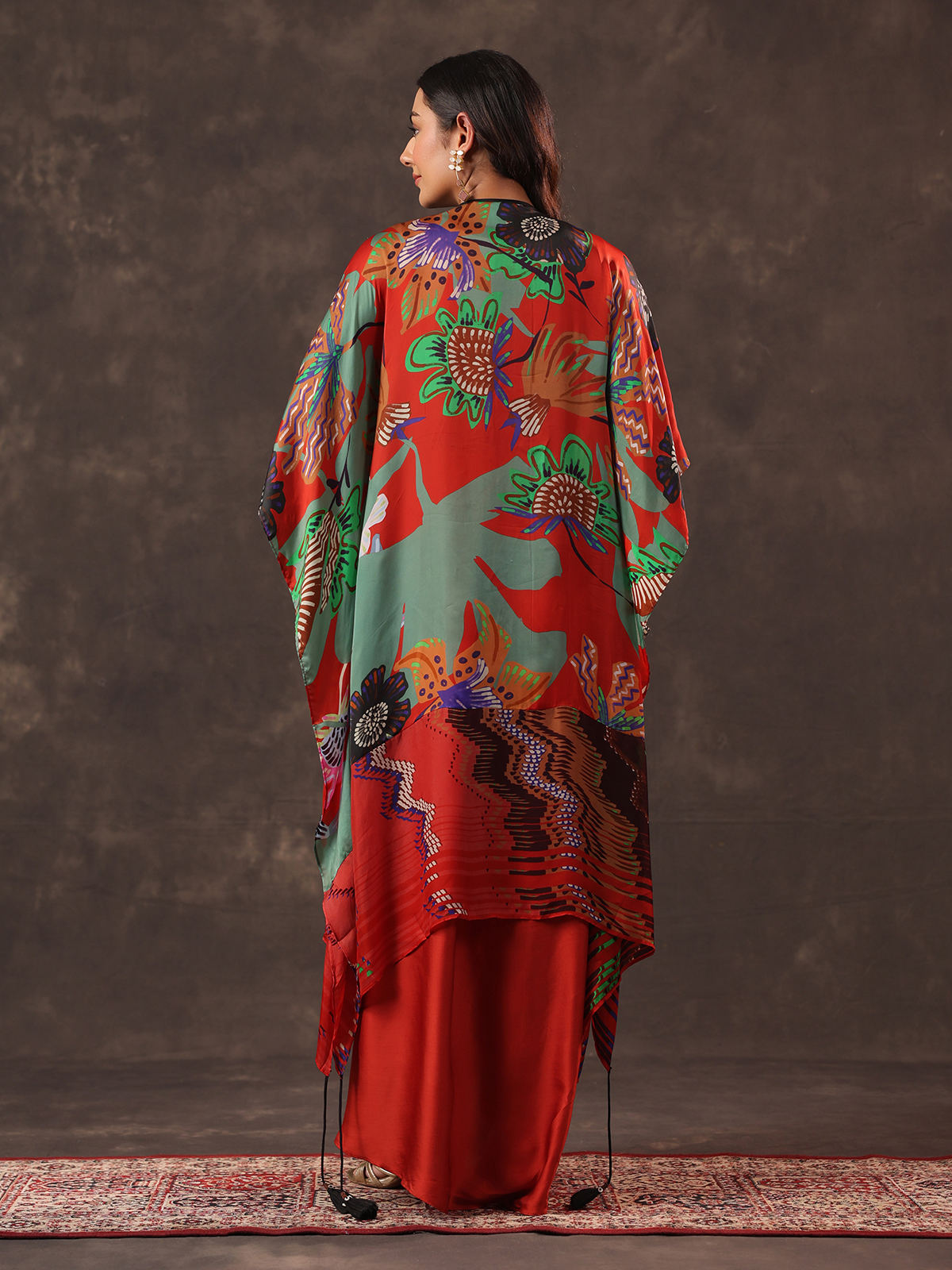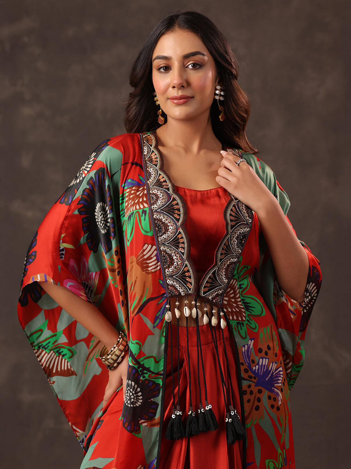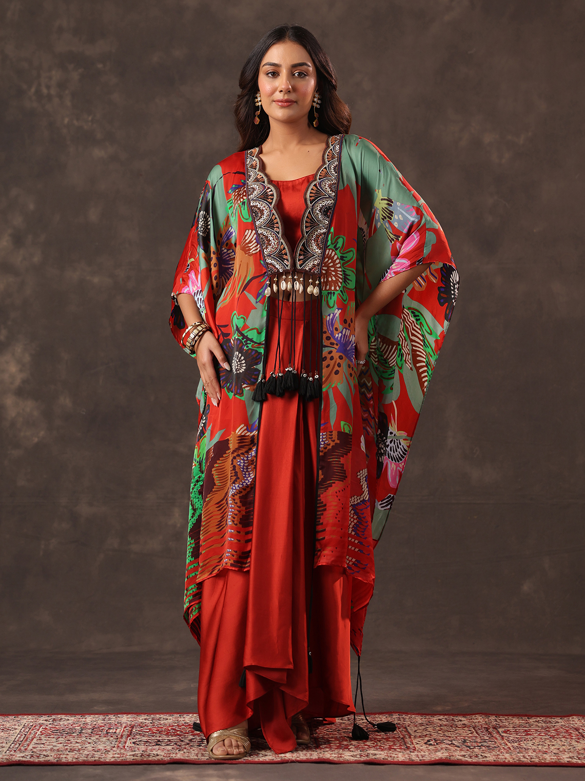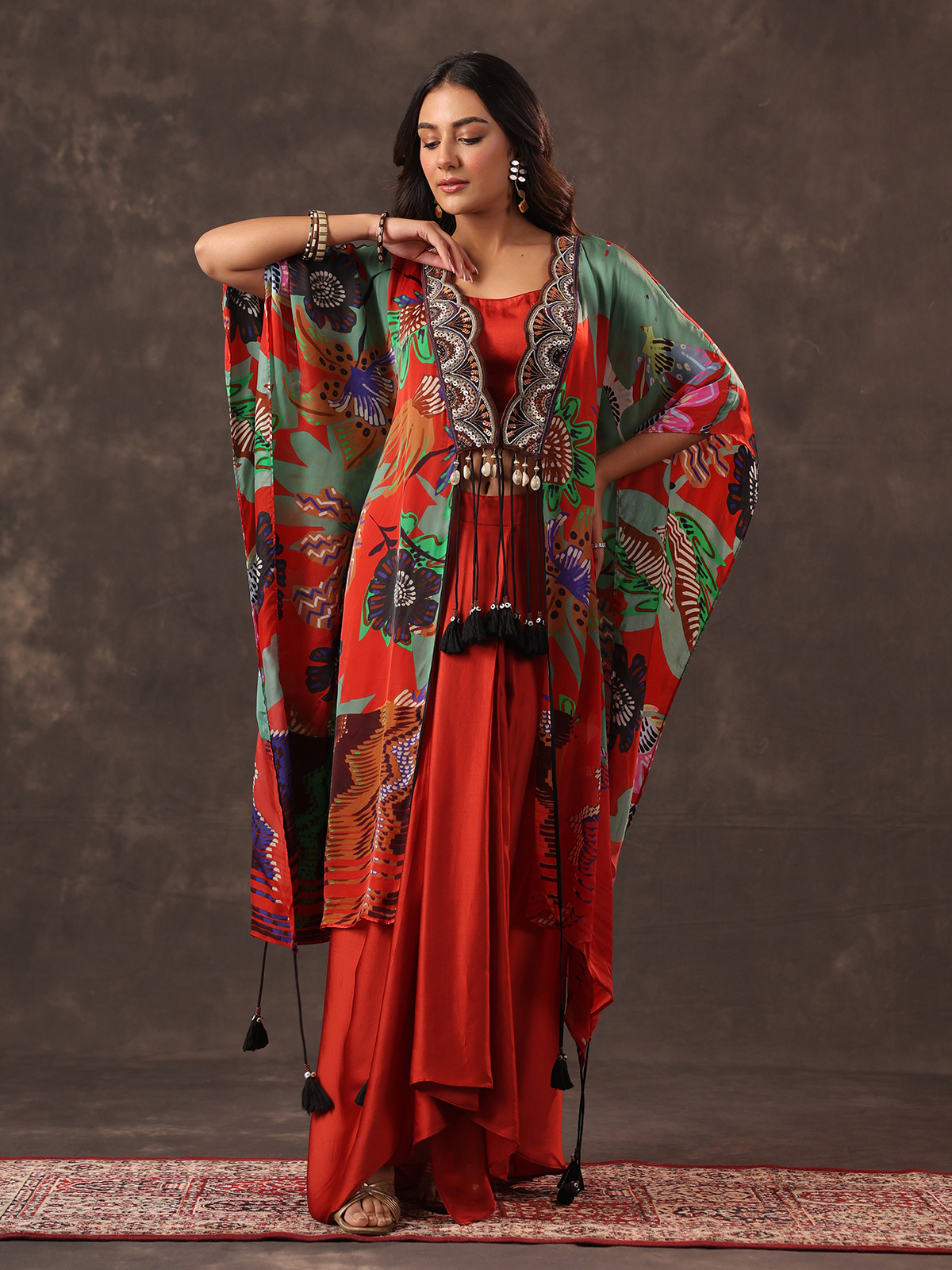 Bold red tones elevate this crepe silk indowestern suit designed in kaftan style. Detailed with sequins, beads, thread, pearls and cowrie shell accents. It creates a unique festive statement. The flowing design adds effortless elegance, perfect for celebrations and parties.
