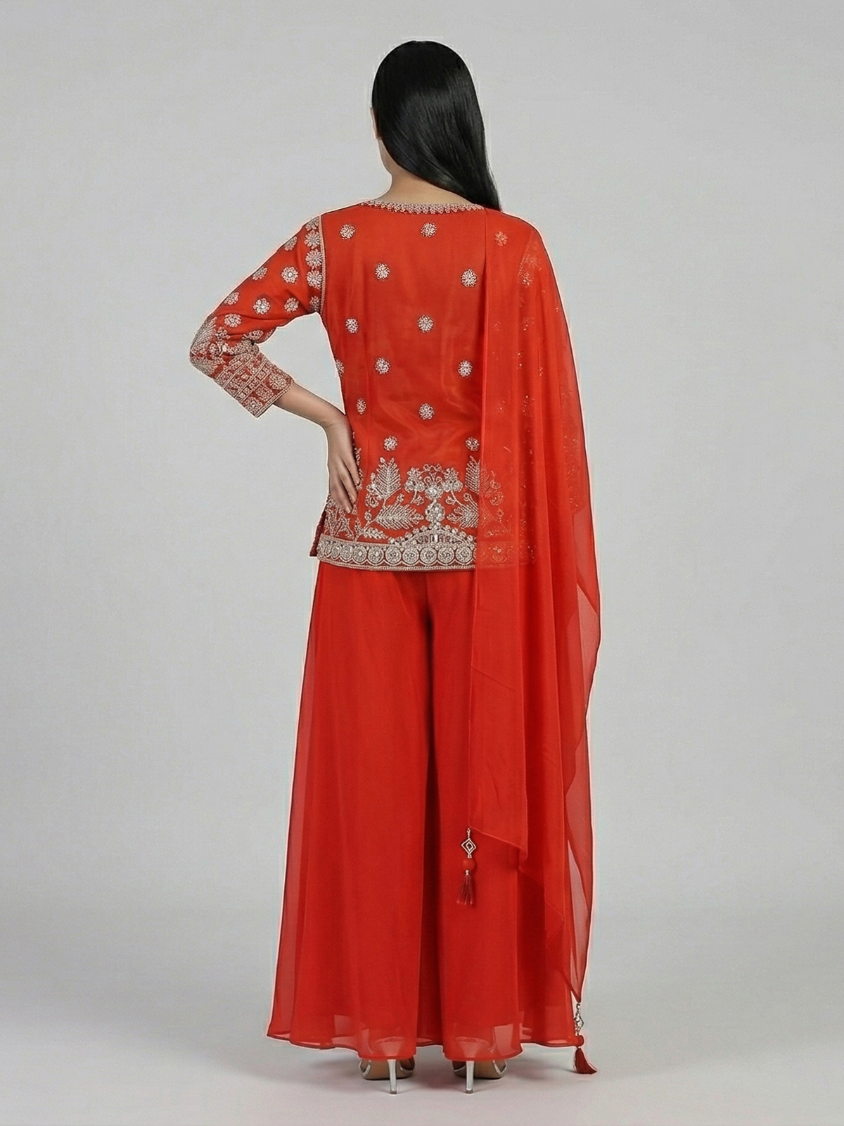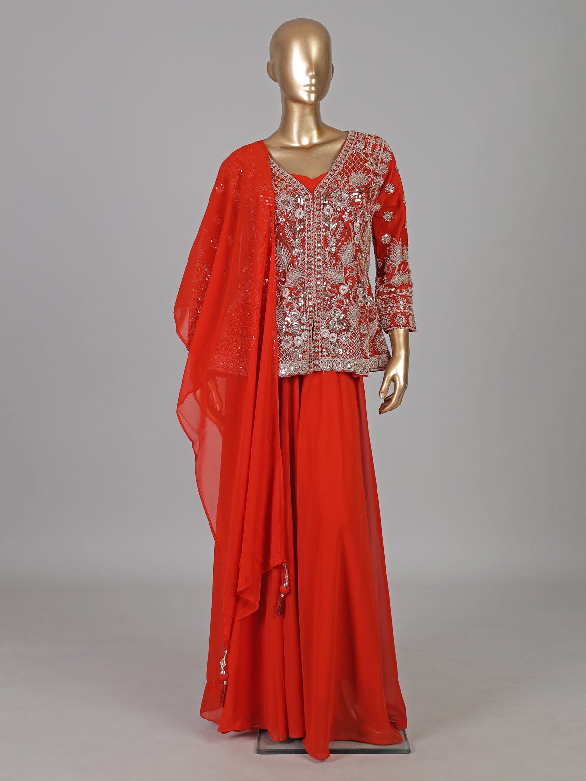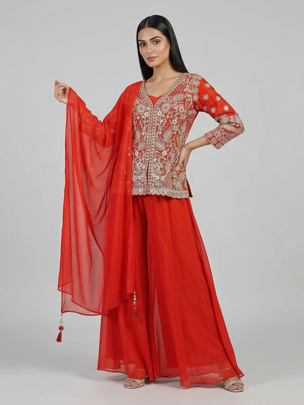 Bold red tones enhance this georgette palazzo suit crafted in elegant pakistani style. Detailed with cutdana, sequins and thread work. It reflects vibrant festive charm. The sweetheart neckline with quarter sleeves adds a graceful touch. Paired with a dupatta and palazzo pants. It is ideal for weddings and sangeet occasions.