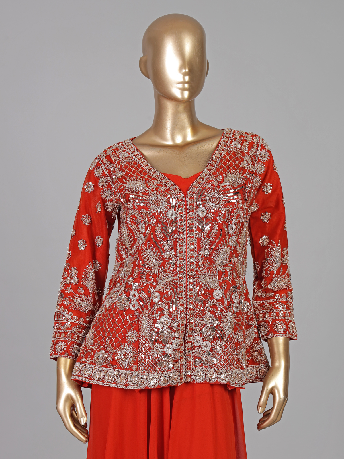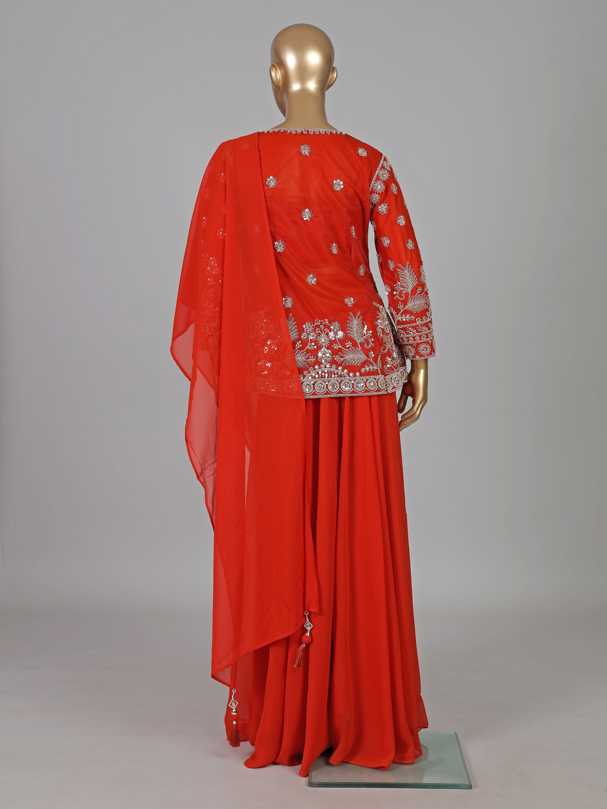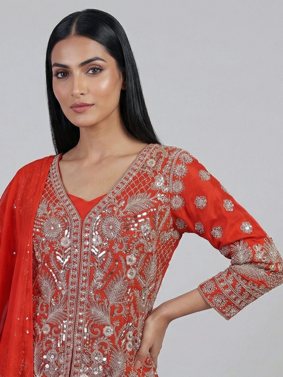 Bold red tones enhance this georgette palazzo suit crafted in elegant pakistani style. Detailed with cutdana, sequins and thread work. It reflects vibrant festive charm. The sweetheart neckline with quarter sleeves adds a graceful touch. Paired with a dupatta and palazzo pants. It is ideal for weddings and sangeet occasions.