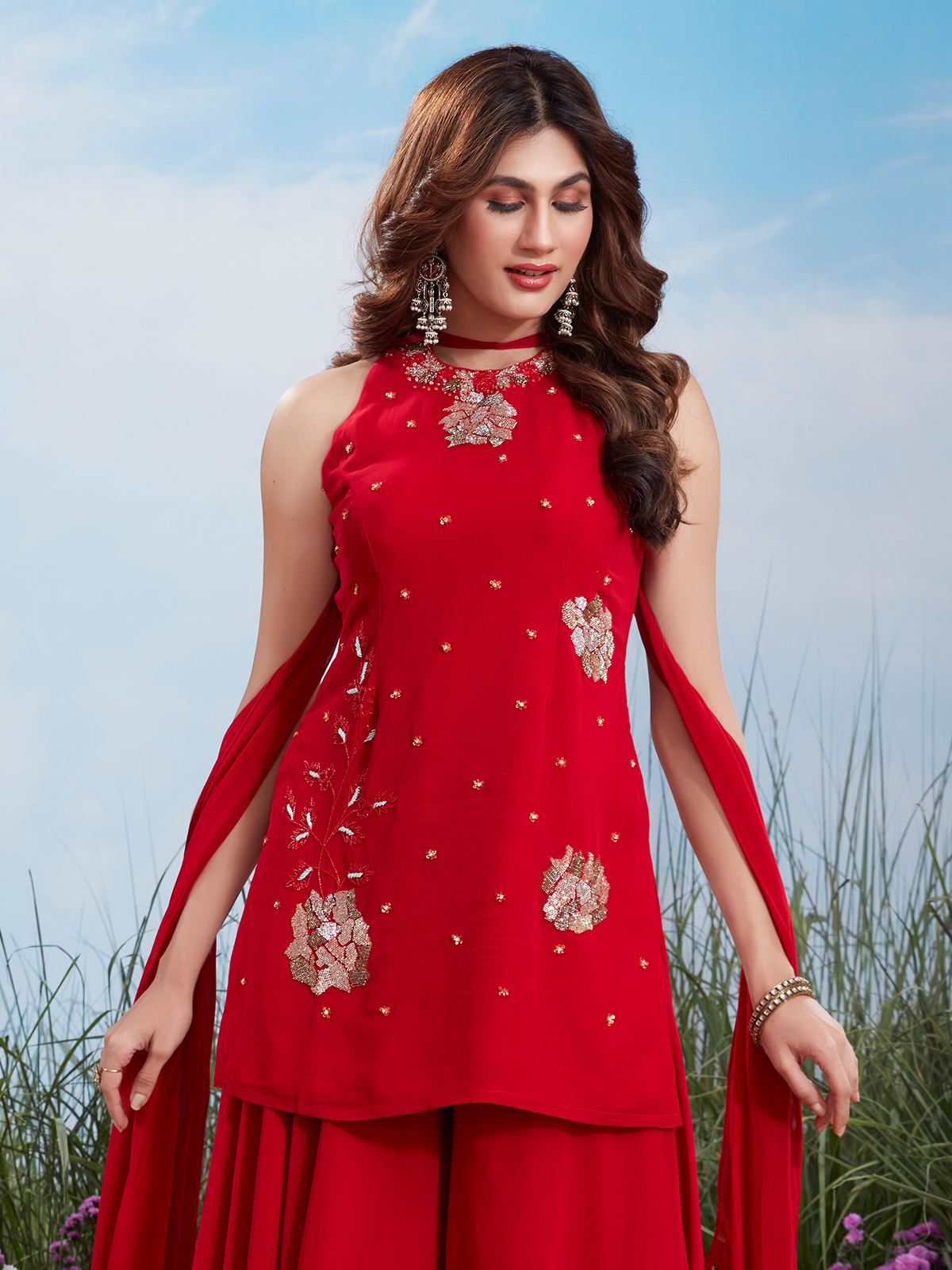This red georgette sleeveless kurta is adorned with sequins and cutdana embroidery. Round neckline and palazzo bottoms offer comfort and style. Ideal for weddings and festive gatherings, it blends contemporary silhouettes with traditional embellishments, creating a glamorous, head-turning festive ensemble.