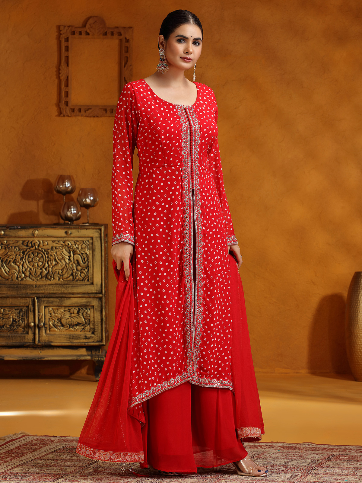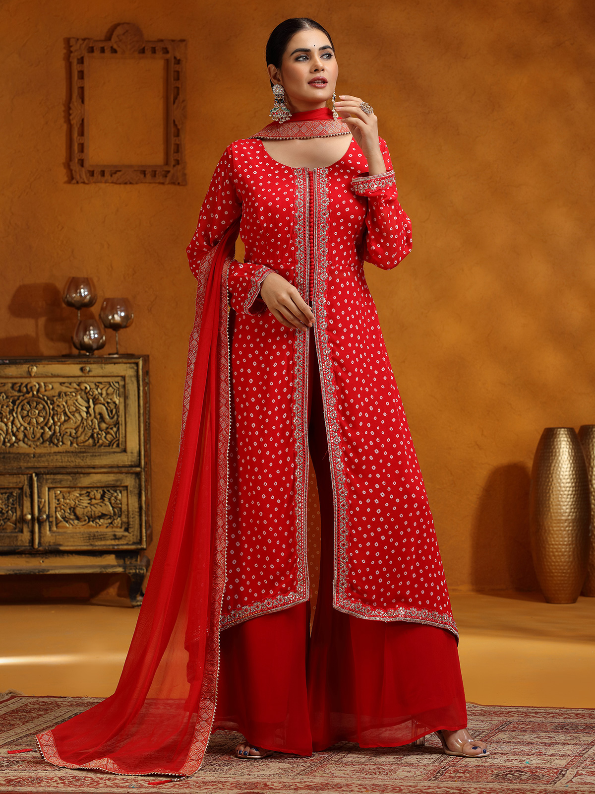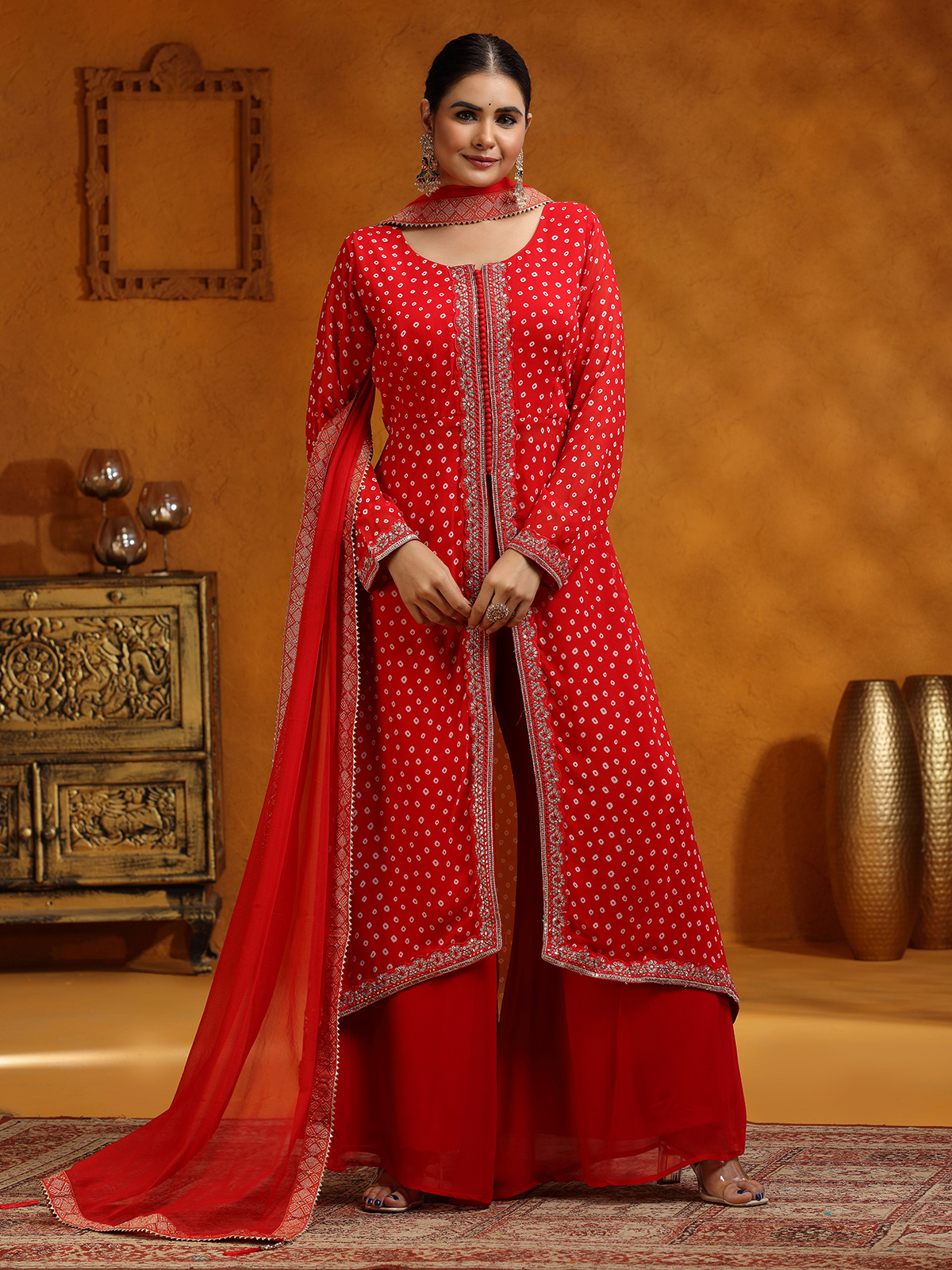Elevate your ethnic style with this red printed georgette palazzo salwar suit. Embellished with aabla, resham, sequins, and stone work, it has a round neck and full sleeves. Comes with a dupatta.