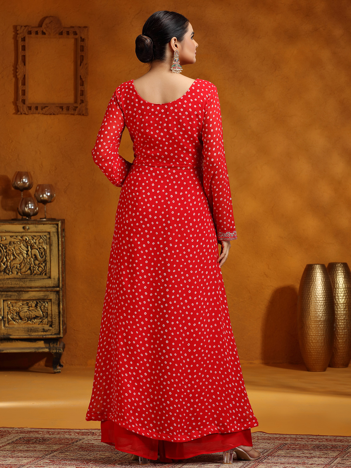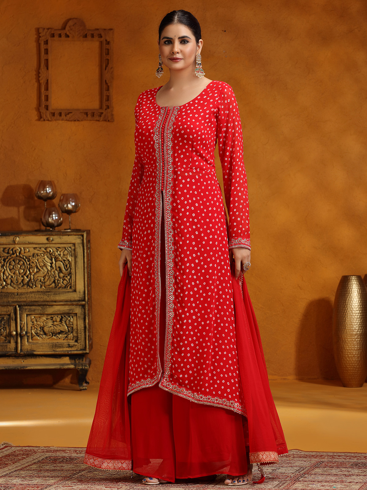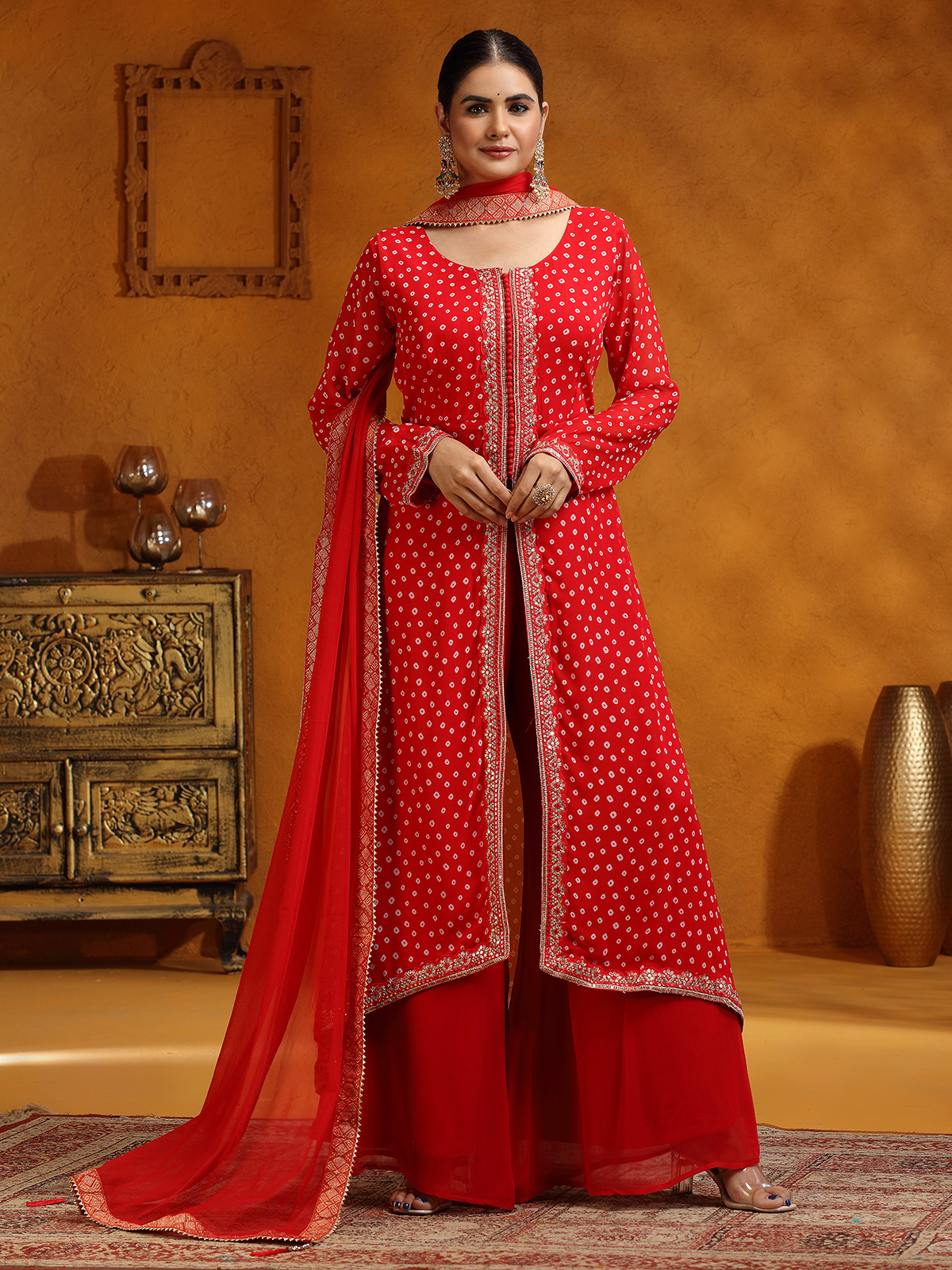 Elevate your ethnic style with this red printed georgette palazzo salwar suit. Embellished with aabla, resham, sequins, and stone work, it has a round neck and full sleeves. Comes with a dupatta.