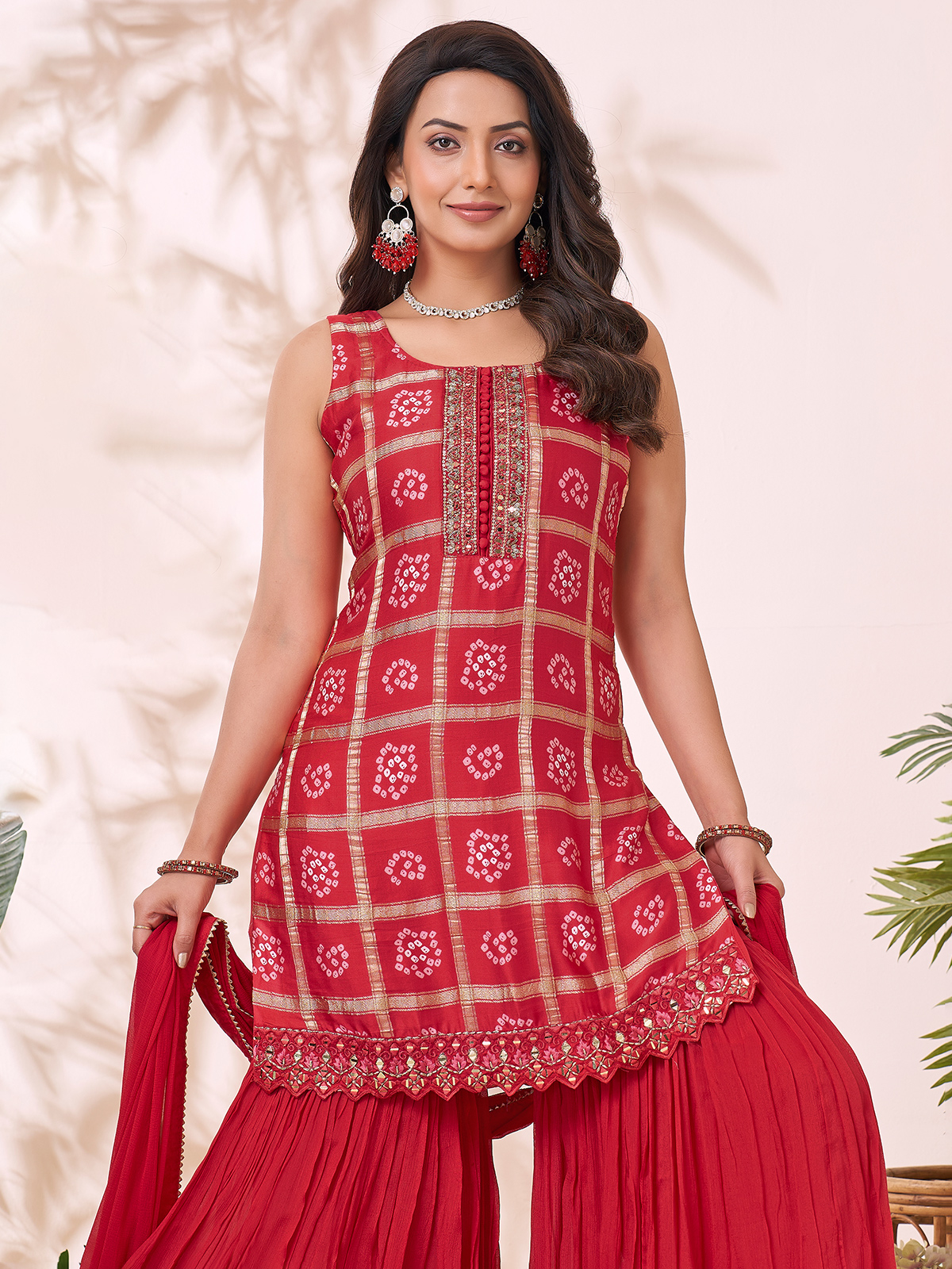 In vibrant red, this printed silk sharara suit showcases embroidery, beads, zari, zardosi, and sequins. Its sleeveless round neck and dupatta complete the richly detailed look.
