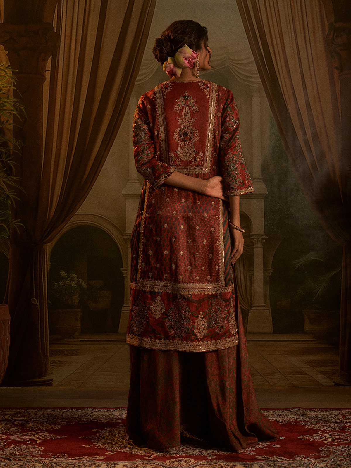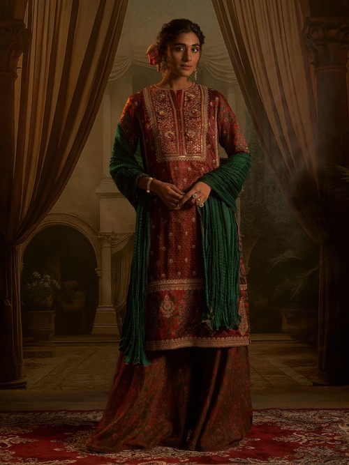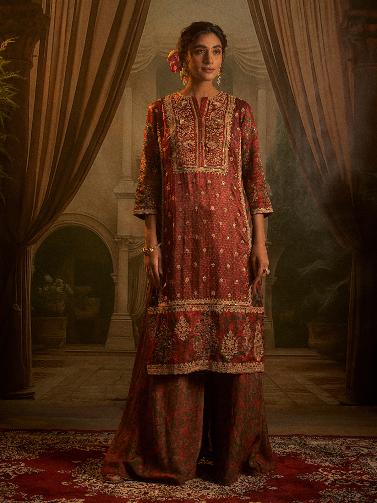 Radiant hues come alive in this red silk Pakistani palazzo suit, crafted for vibrant occasions. Detailed with resham, sequins, and beads, its printed fabric shimmers with artistry. Quarter sleeves complete the design, blending comfort and sophistication, perfect for festive gatherings that call for tradition wrapped in graceful vibrance.