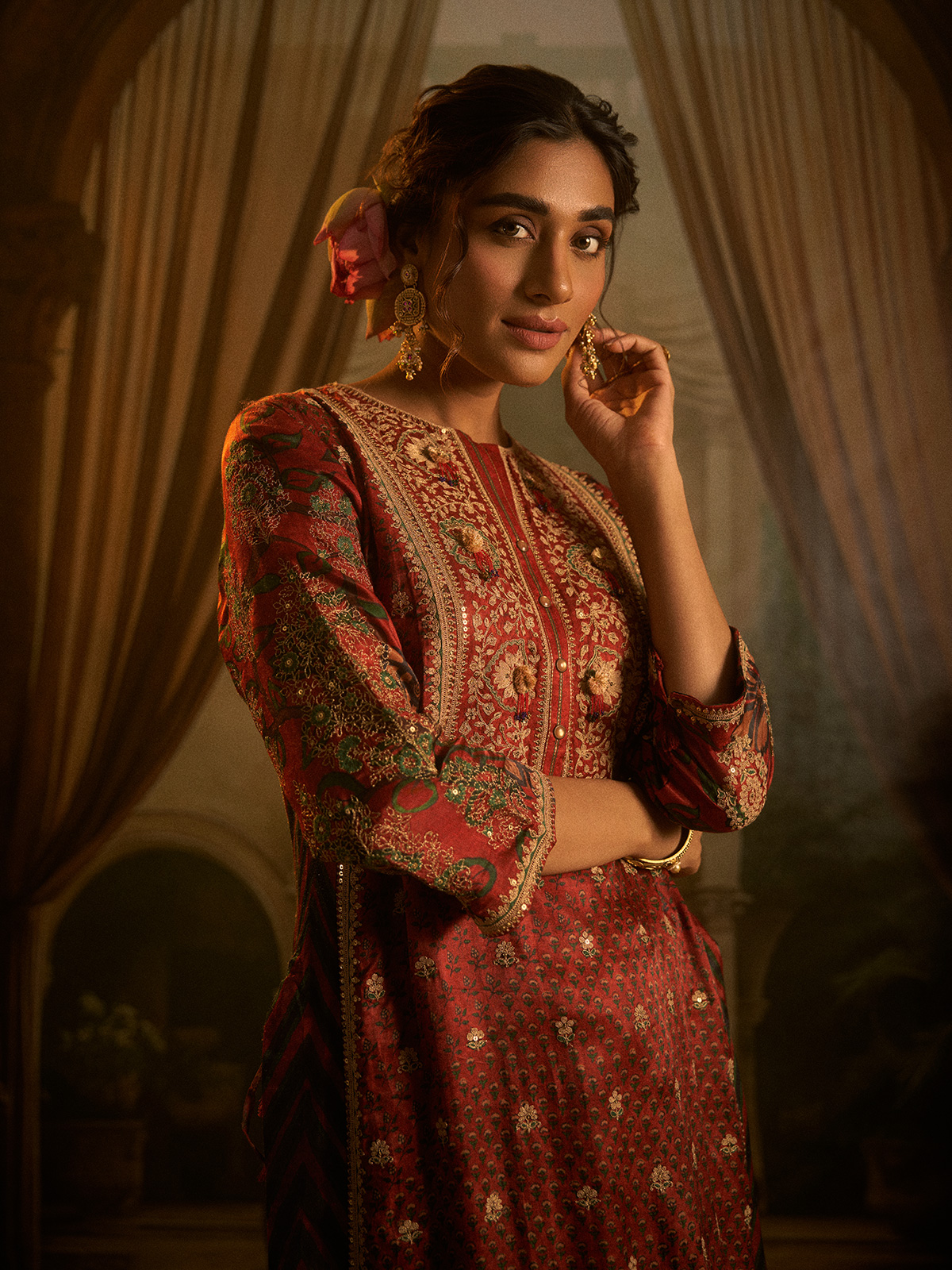 Red Printed Silk Pakistani Suit For Festive Elegance